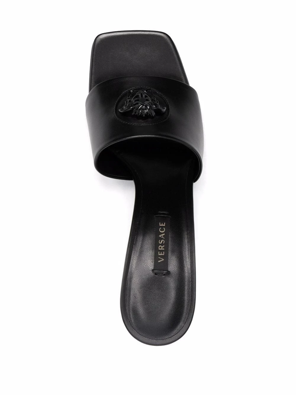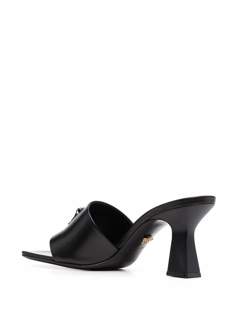 Motif Medusa, bout ouvert, semelle intérieure griffée, bout ouvert, talon mi-haut sculpté. Couleur : noir. Matière : cuir.