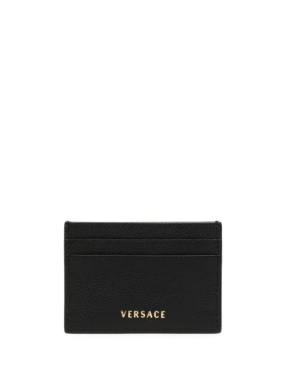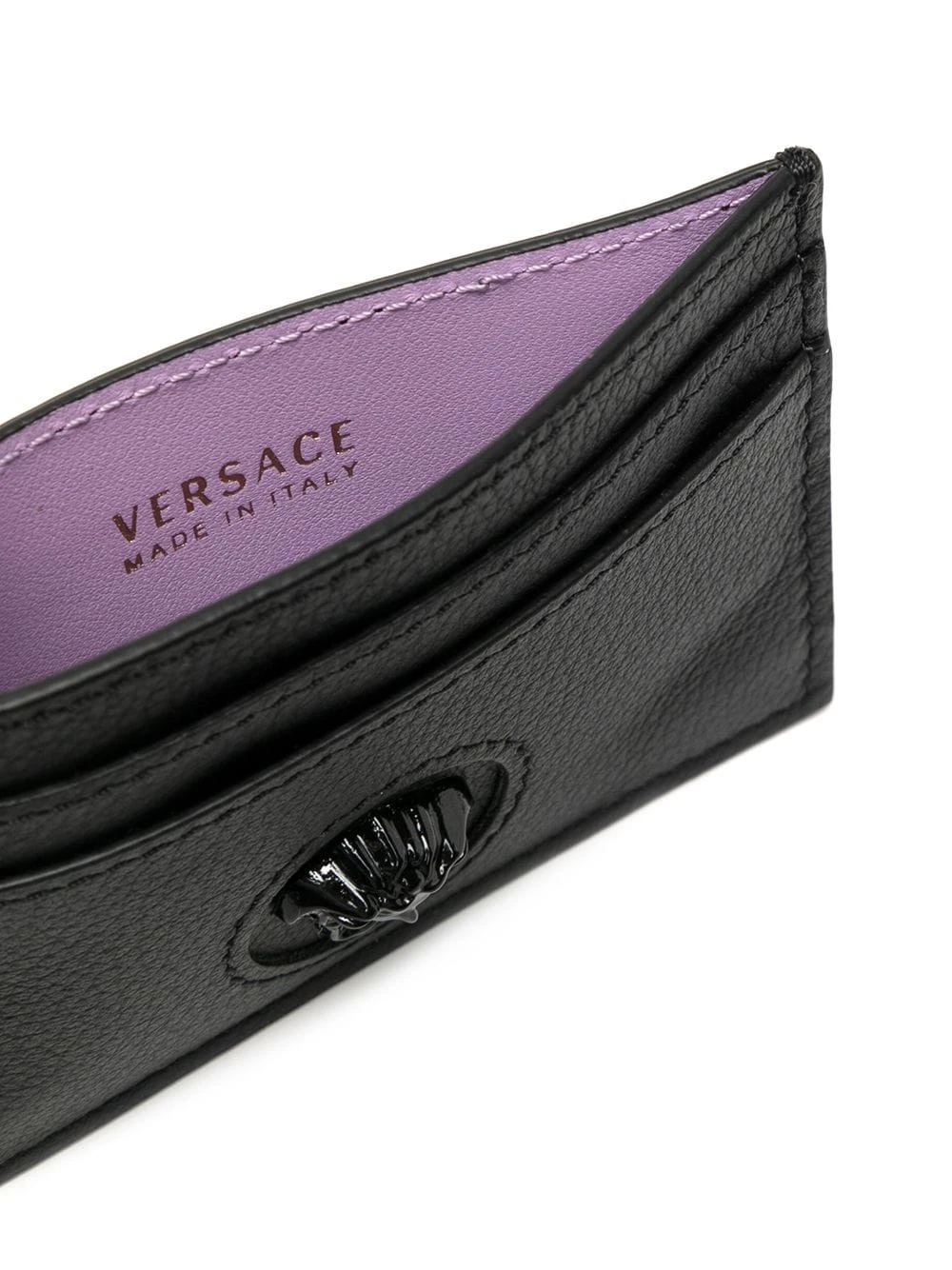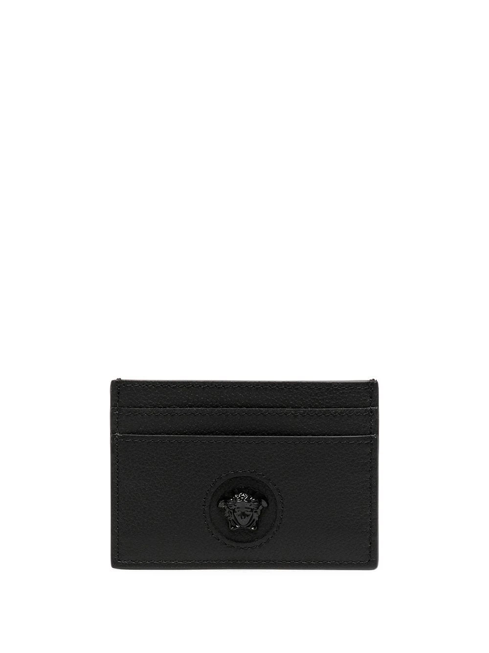 Texture grainée, détail Medusa, logo imprimé à l’arrière, fentes pour carte. Couleur : noir. Matière : cuir de veau.