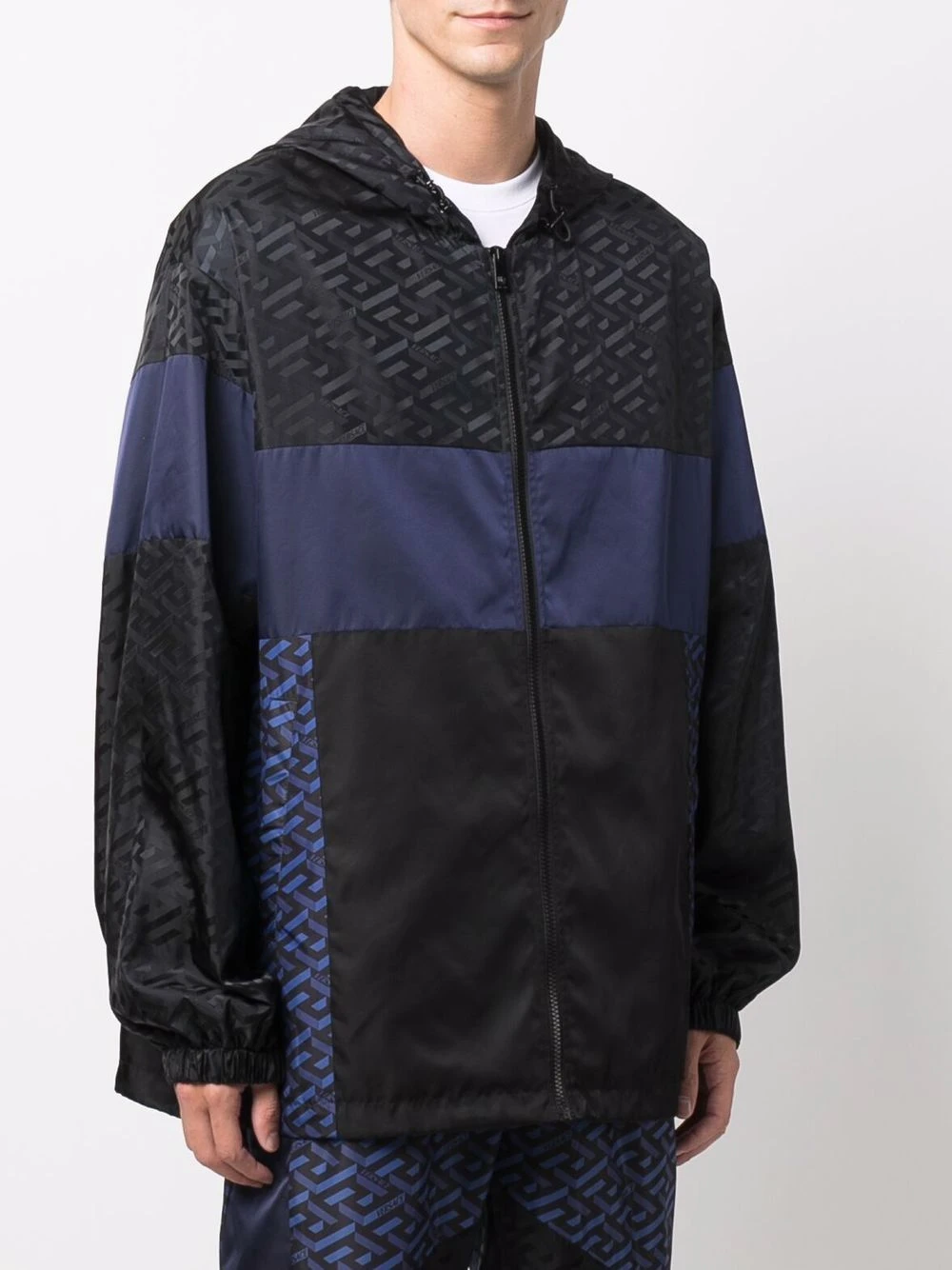 Imprimé monogrammé, logo lettre, design à empiècements, capuche à lien de resserrage, poignets élastiqués, deux poches latérales fendues, fermeture zippée devant.