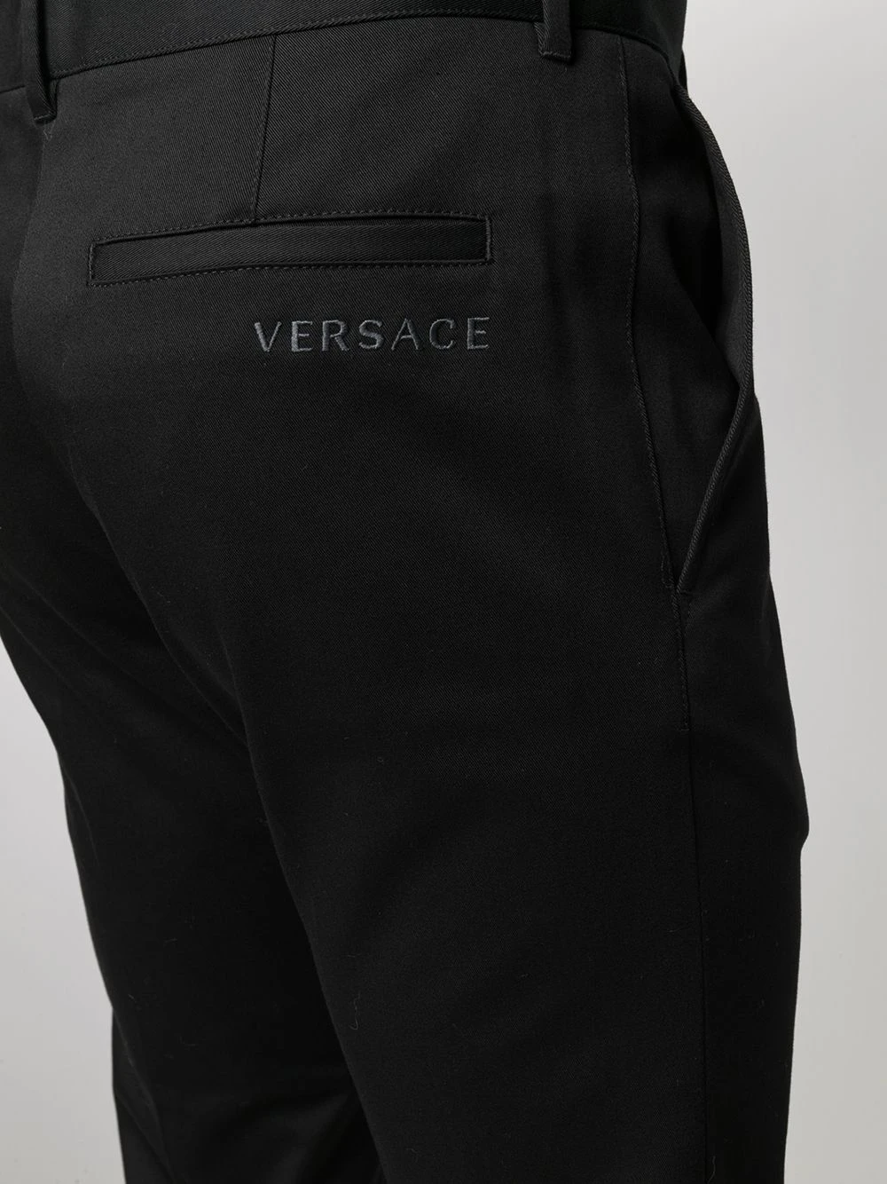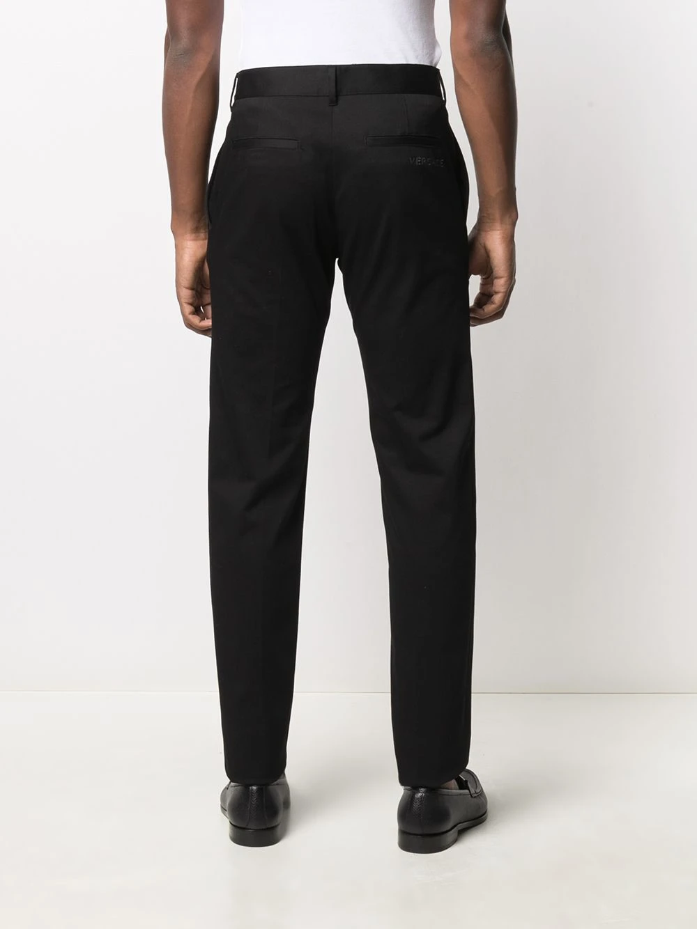 Logo brodé à l’arrière, passants de ceinture, fermeture dissimulée sur le devant, coupe droite, poches latérales fendues, deux poches arrières boutonnées. Couleur : noir.