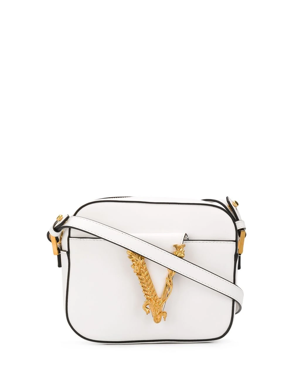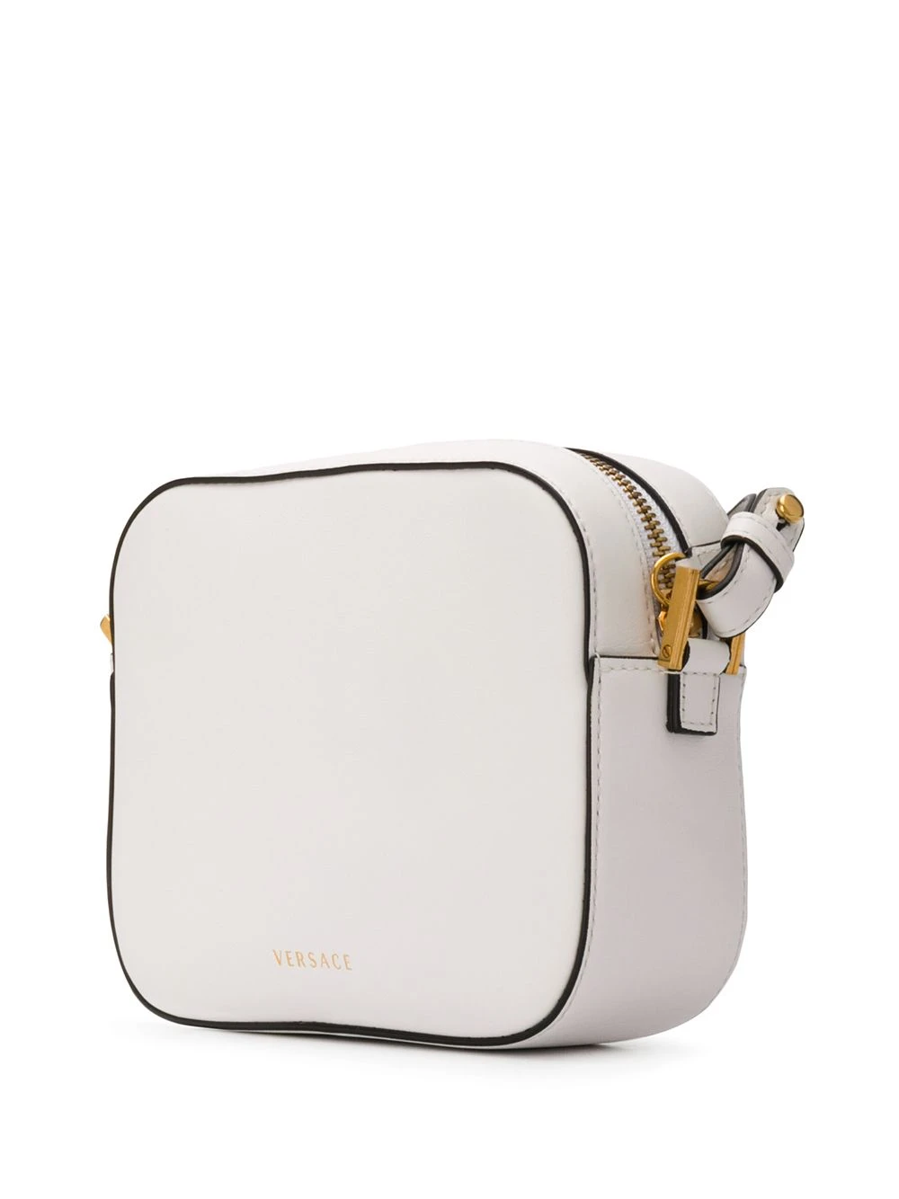 Sac à bandoulière Virtus en cuir Versace avec fermeture zippée sur le dessus, bride portée épaule, poche intérieure plaquée et logo embossé à l’arrière. Couleur : blanc.
