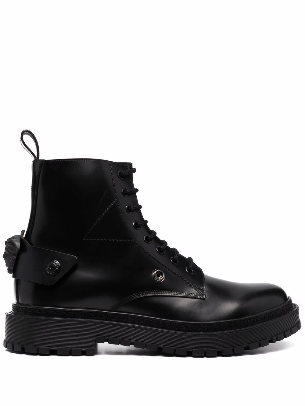 Motif Medusa, design ton sur ton, hauteur cheville, languette d’enfilage au talon, bout rond, fermeture à lacer sur le devant, semelle en caoutchouc. Couleur : noir. Matière : cuir.