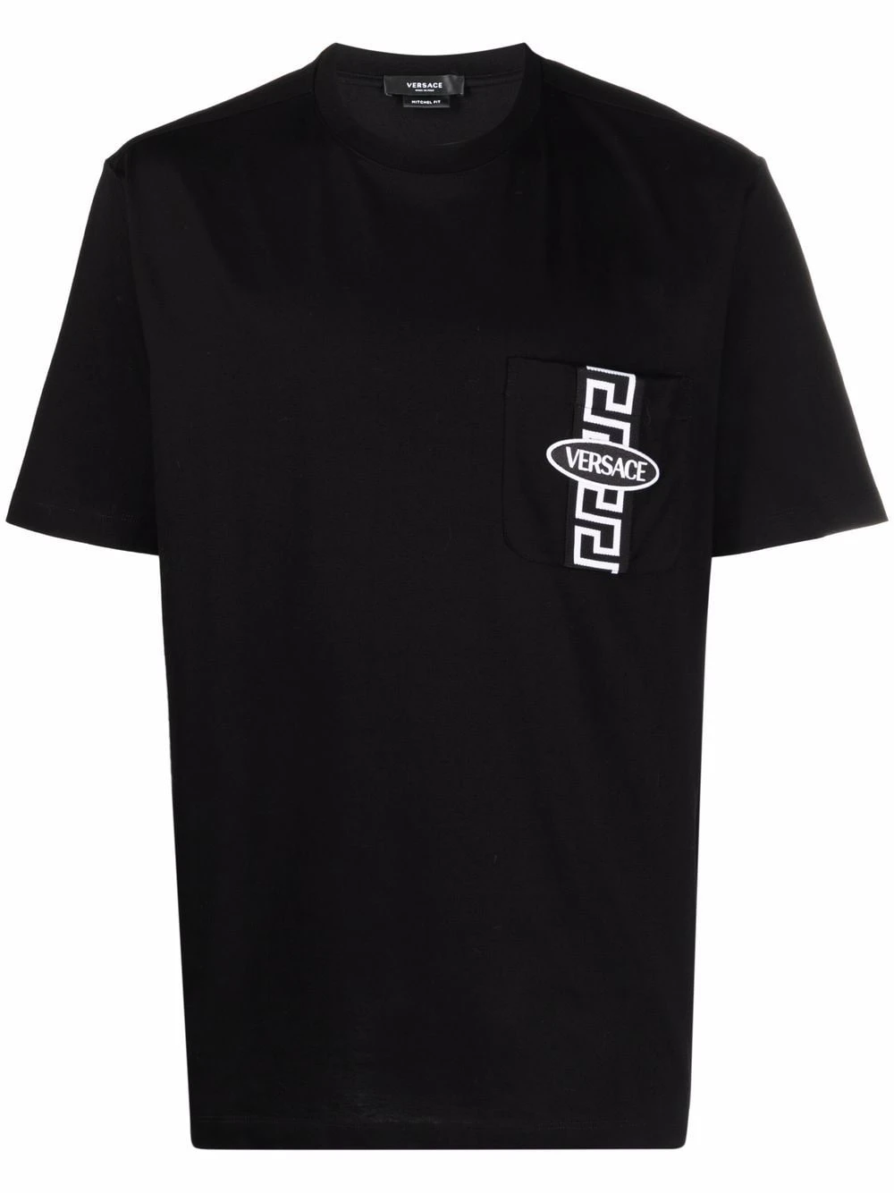 Logo imprimé à la poitrine, détail Greca signature, encolure ronde, manches courtes, ourlet droit. Couleur : noir. Matière : coton.