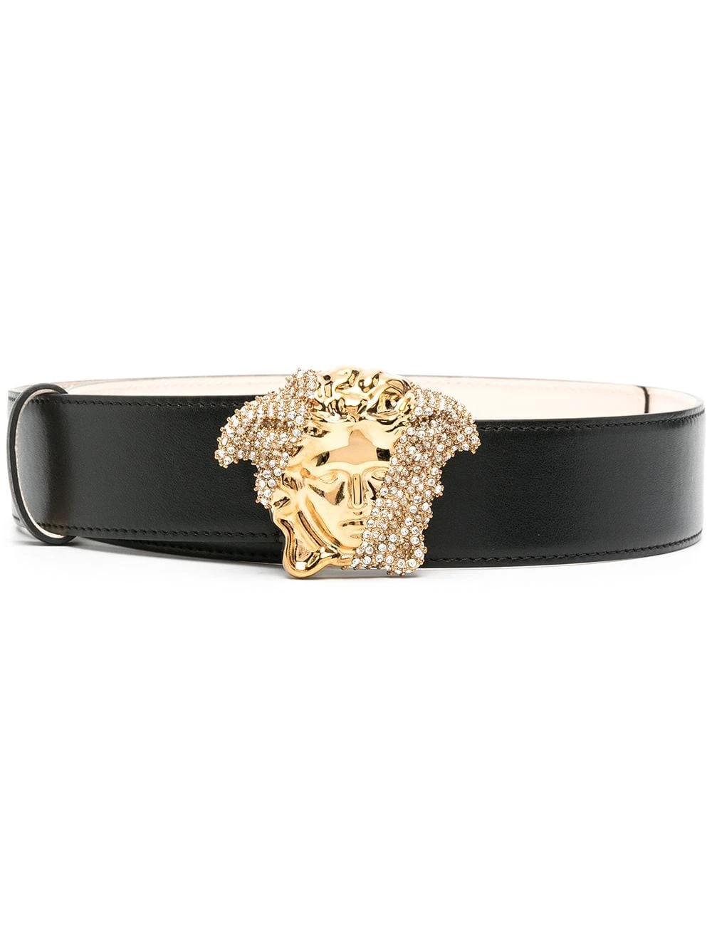 Finitions en métal doré, motif Medusa, ornement en cristal, fermeture à boucle logo, trous percés, taille ajustable. Couleur : noir. Matière : cuir.