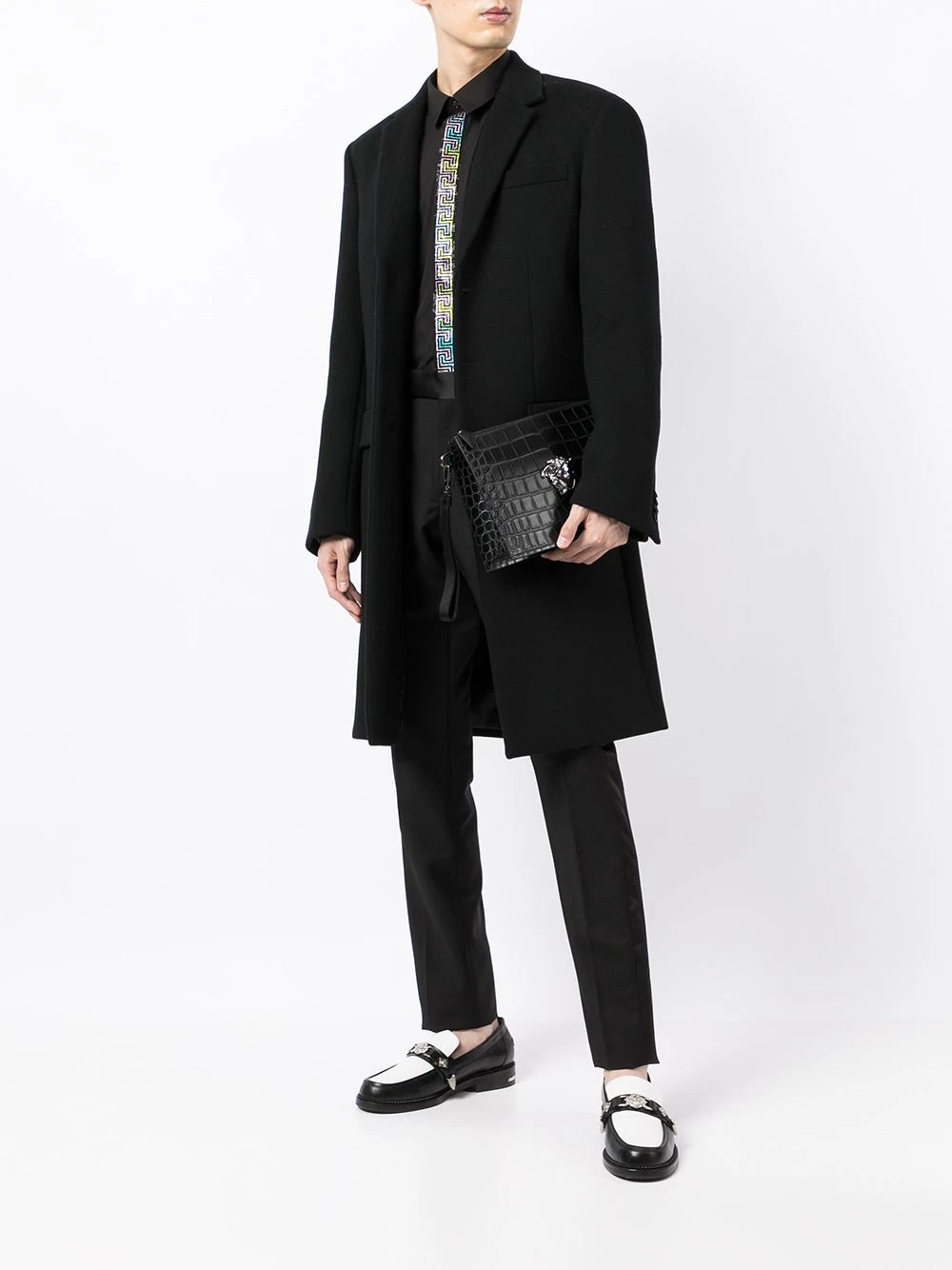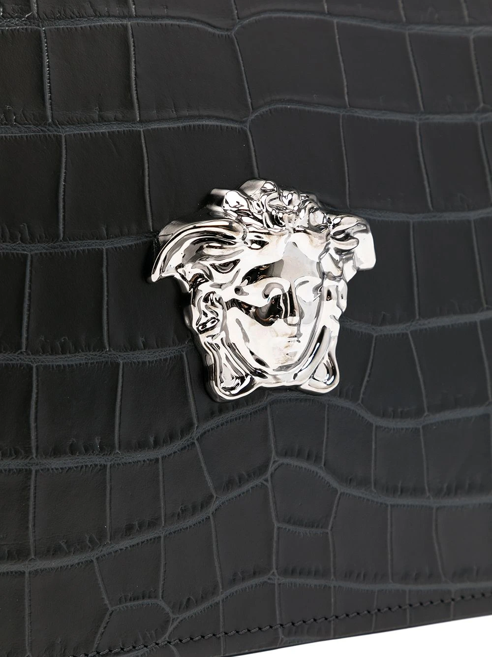 Bride porté poignet, détail Medusa, effet peau de crocodile, fermeture zippée sur le dessus. Couleur : noir. Matière : cuir.