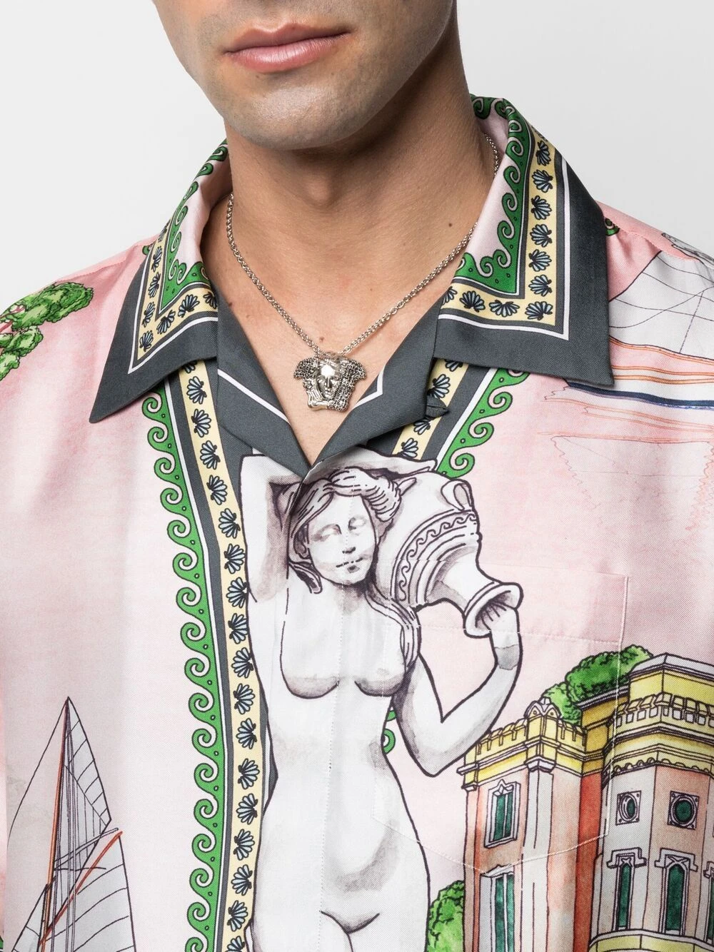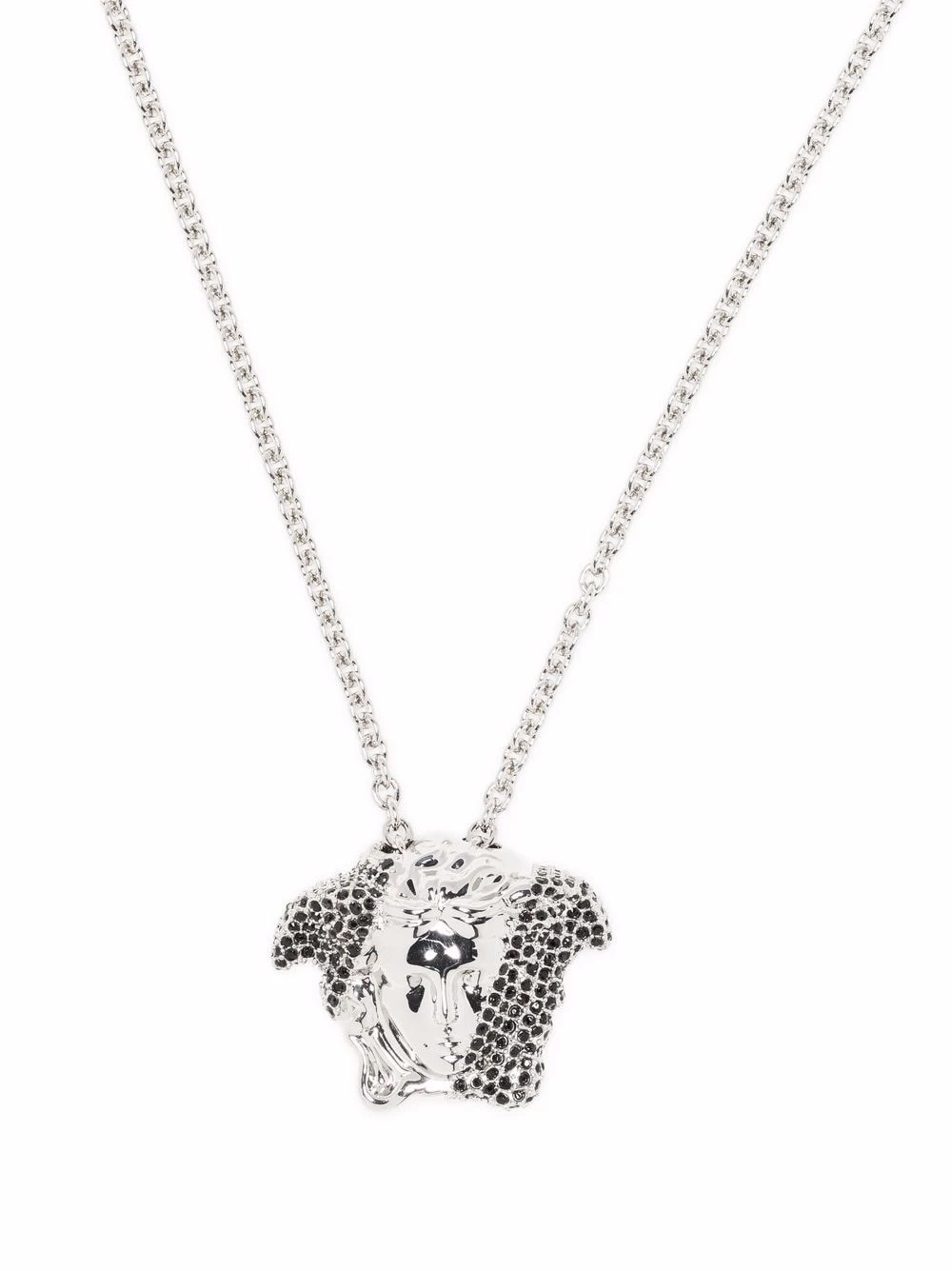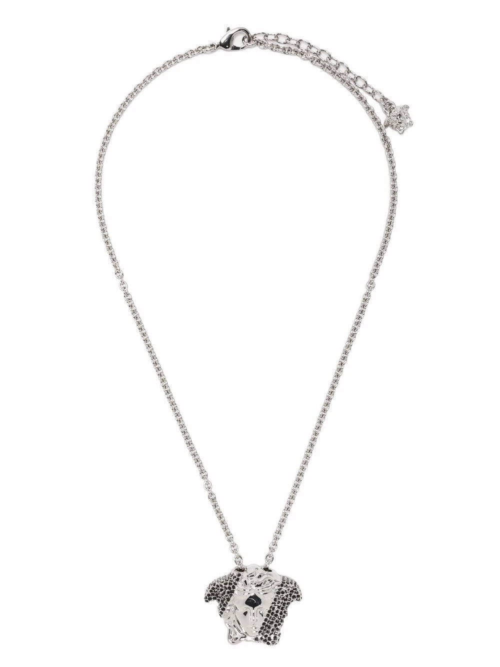 Fermoir mousqueton, chaîne à longueur ajustable, motif Medusa, ornement en cristal. Couleur : argent. Matière : métal.