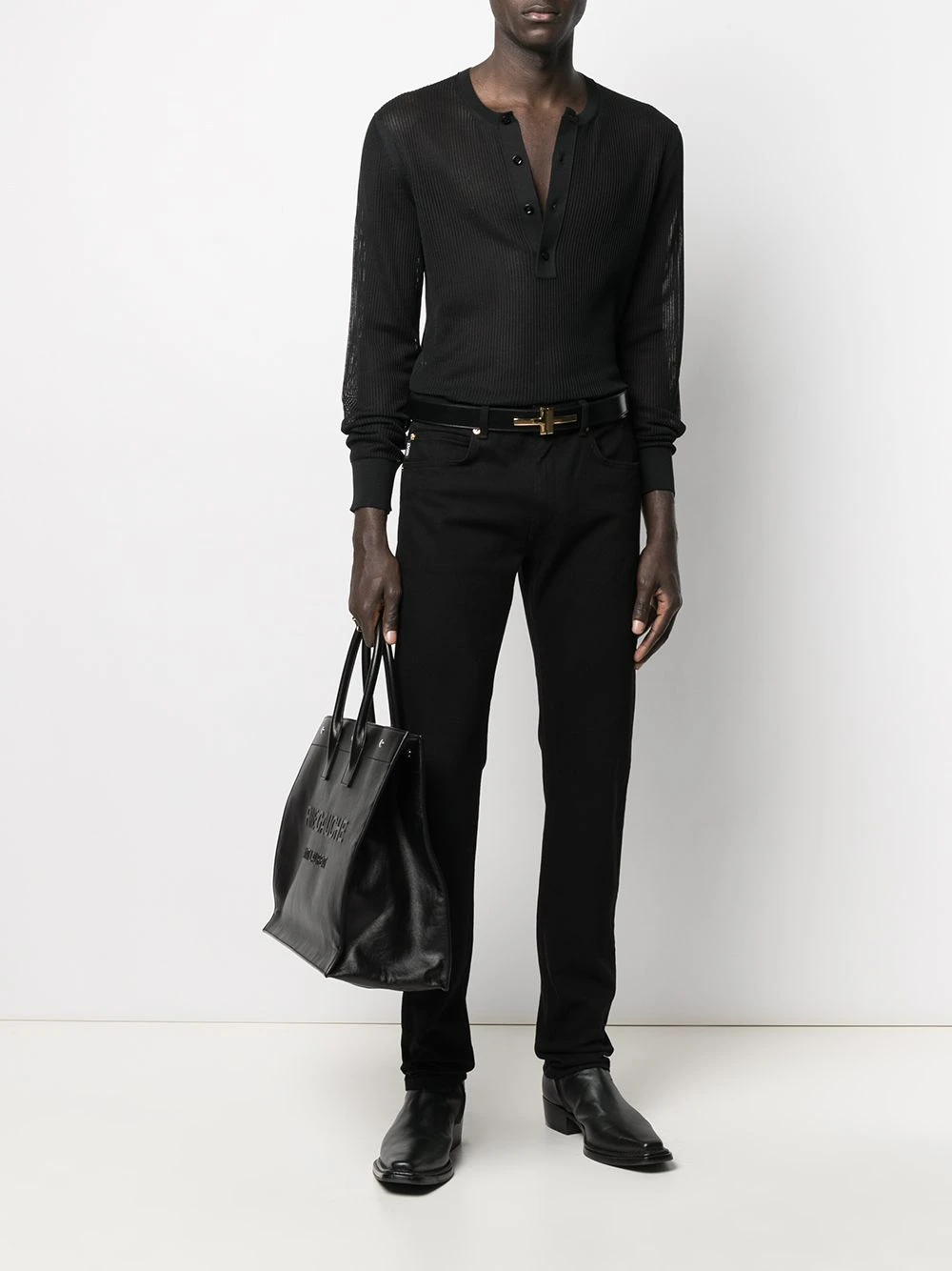 Motif Medusa, patch logo embossé sur l’arrière, coupe slim, fermeture à zip et boutons sur le devant, passants de ceinture, 5 poches classiques. Couleur : noir.
