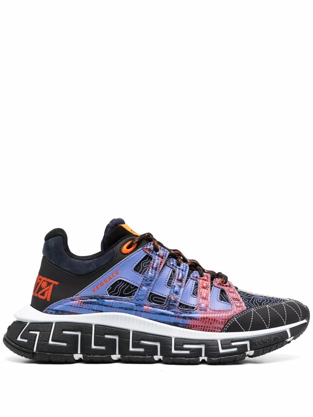 Détail Greca signature, languette à patch logo, semelle intérieure à logo, bout rond, fermeture à lacer sur le devant, semelle en caoutchouc.