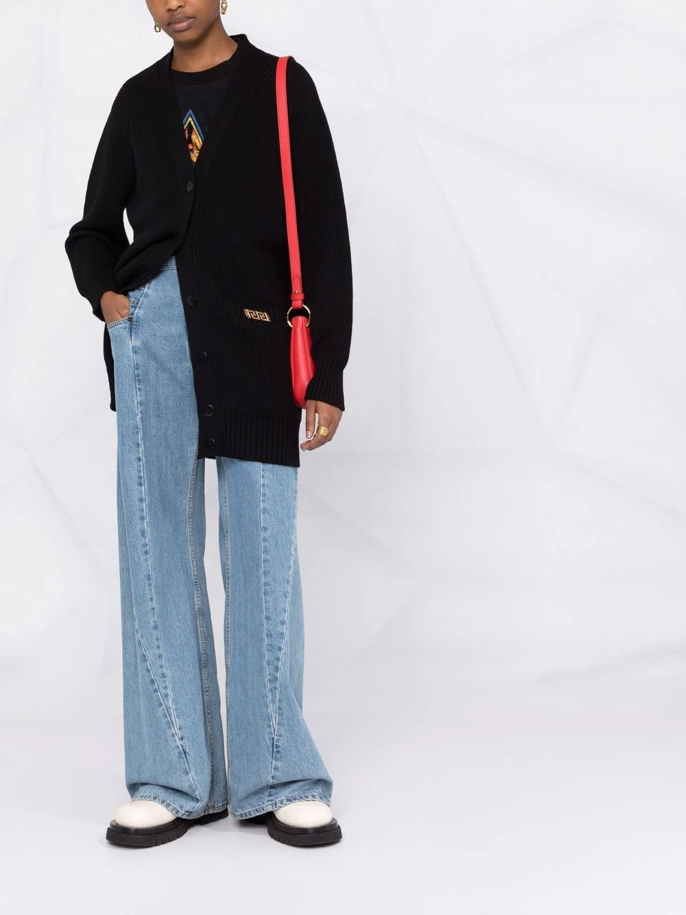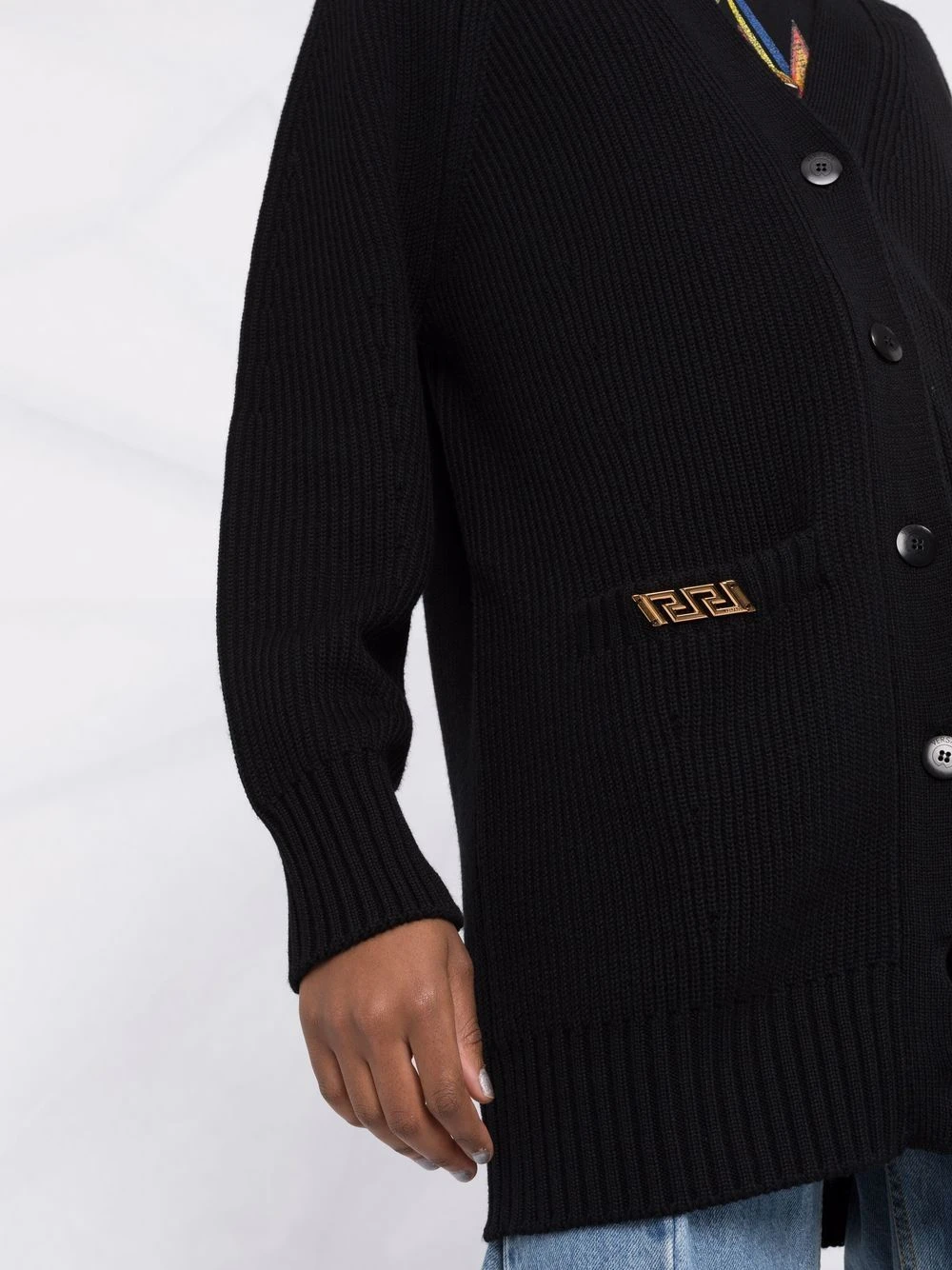 Détail Greca signature, plaque logo dorée, manches longues, col v, deux poches plaquées avant, boutonnière sur le devant. Couleur : noir. Matière : laine.