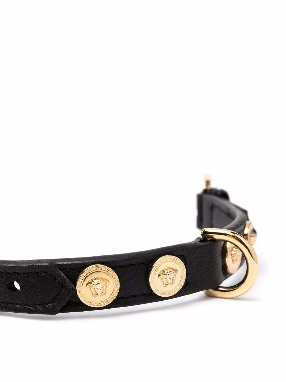 Détail Medusa, fermeture à boucle, taille ajustable. Couleur : noir. Matière : cuir.
