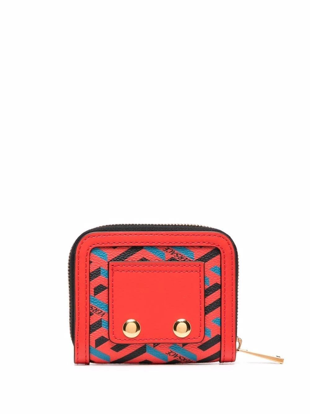 Fini verni, imprimé La Greca signature, fermeture zippée tout autour, compartiment intérieur. Couleur : rouge. Matière : cuir.