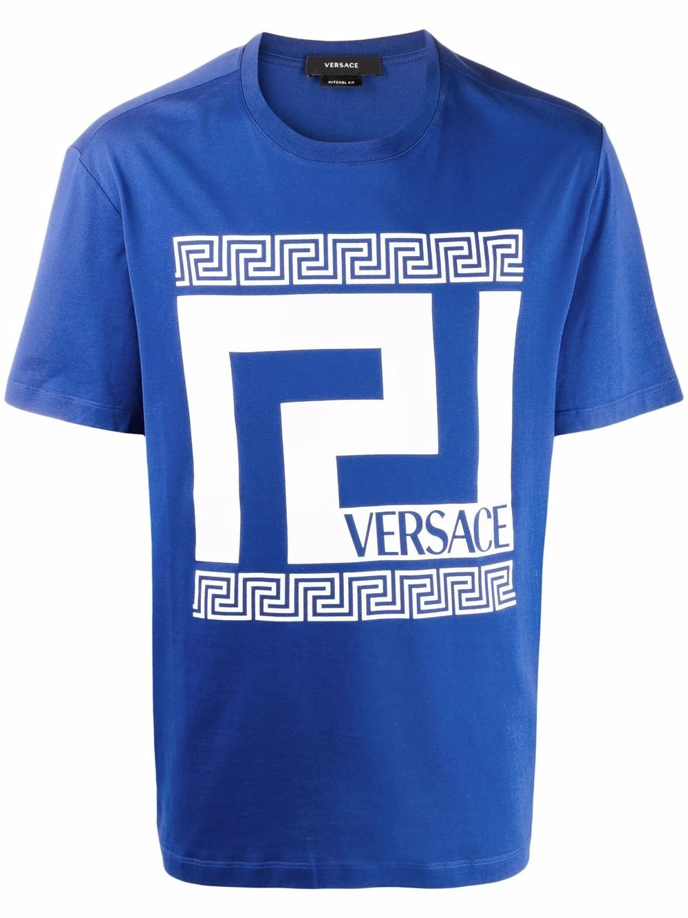 Logo imprimé sur le devant, motif Greca signature imprimé, encolure ronde, manches courtes, ourlet droit. Couleur : bleu. Matière : coton.