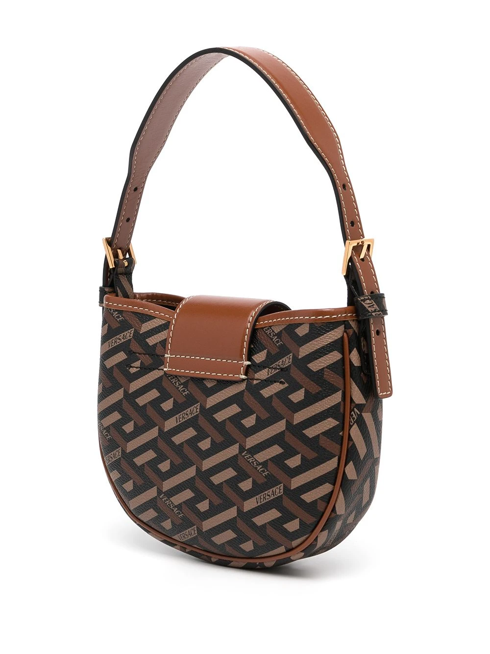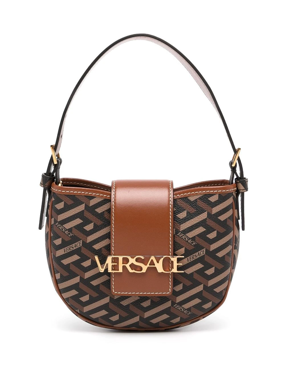 Imprimé La Greca signature, plaque logo dorée, bretelle portée épaule unique, rabat sur le devant. Matière : cuir.