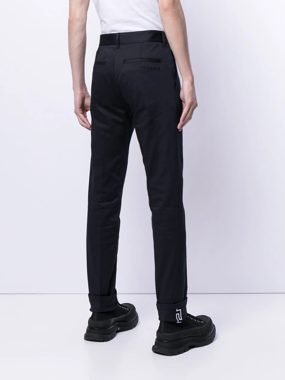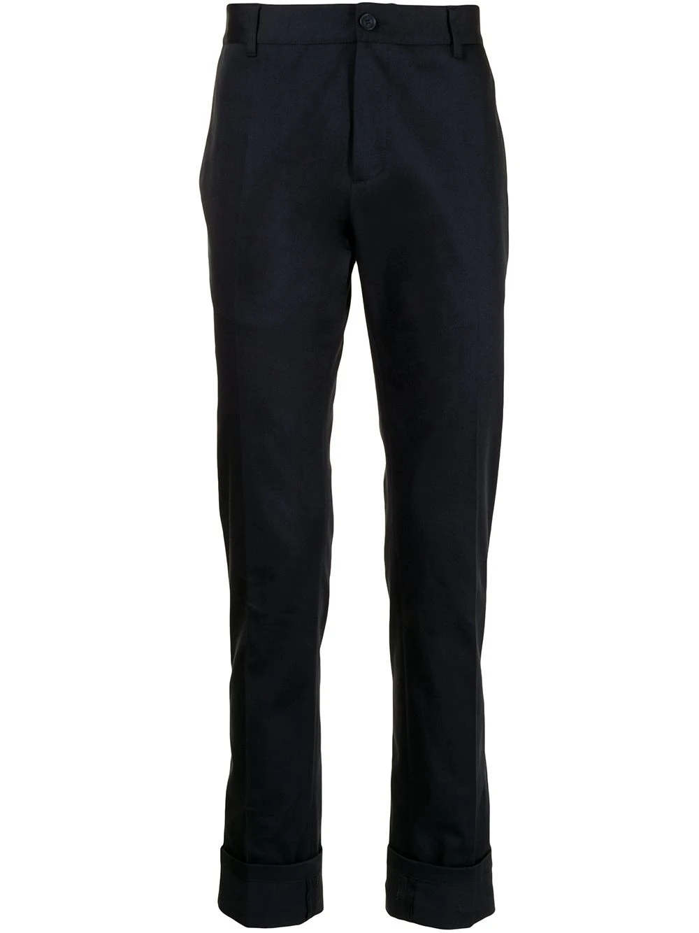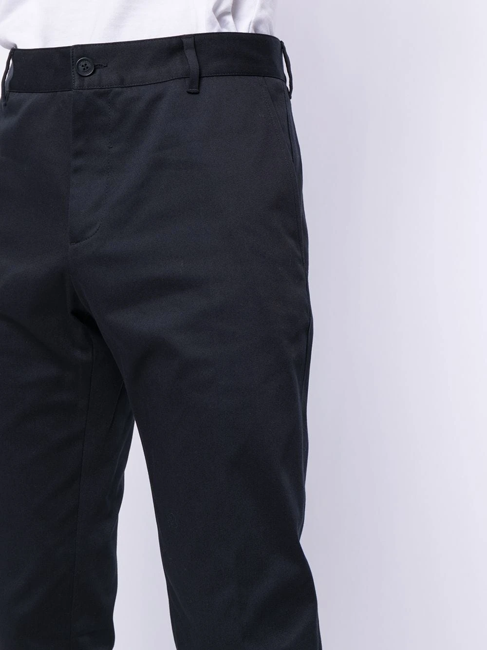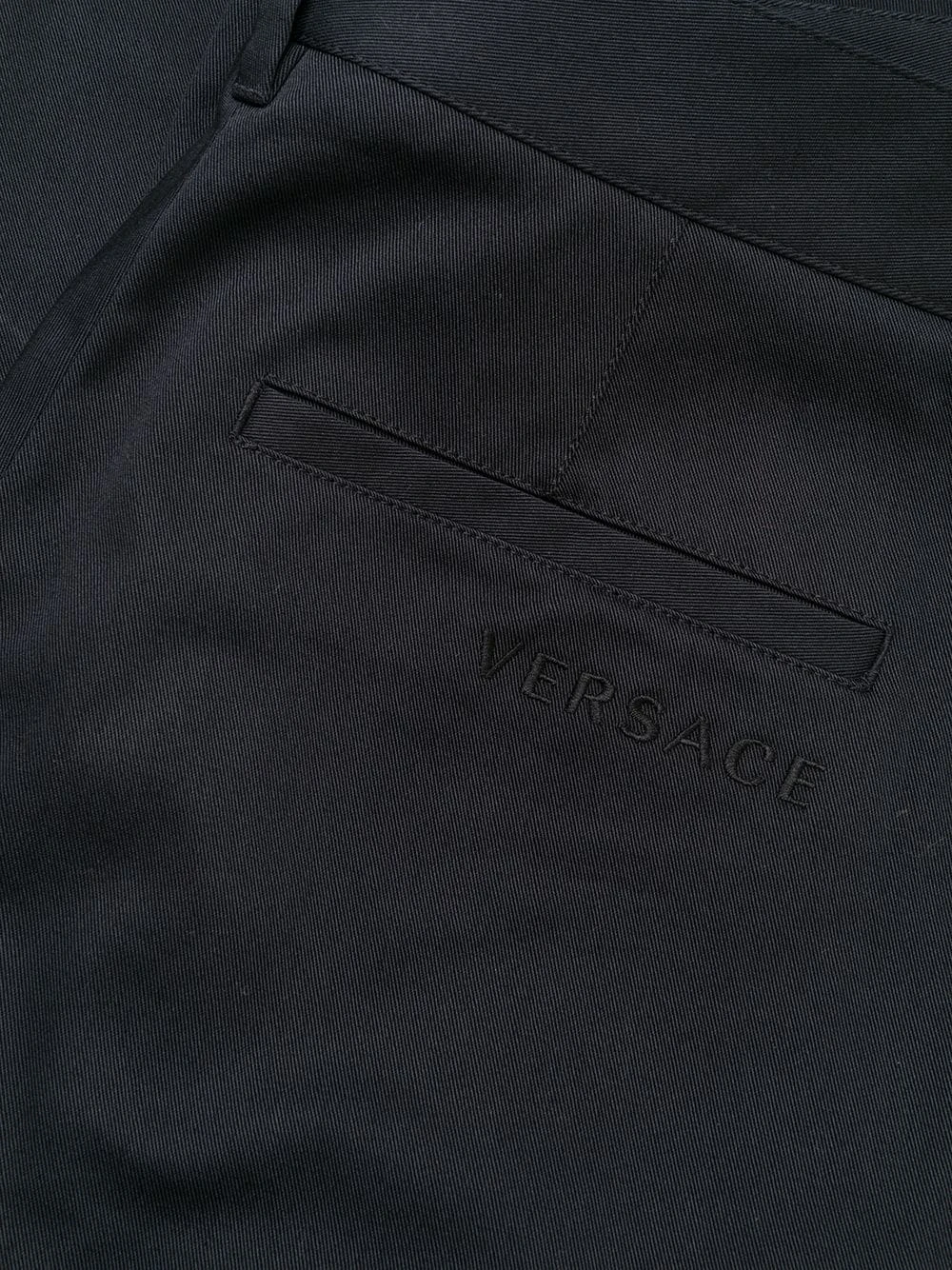 Passants de ceinture, coutures ton sur ton, fermeture à zip et boutons sur le devant, poches plaquées latérales, poches arrière passepoilées, coupe ajustée, poignets retroussés. Couleur : noir. Matière : coton.