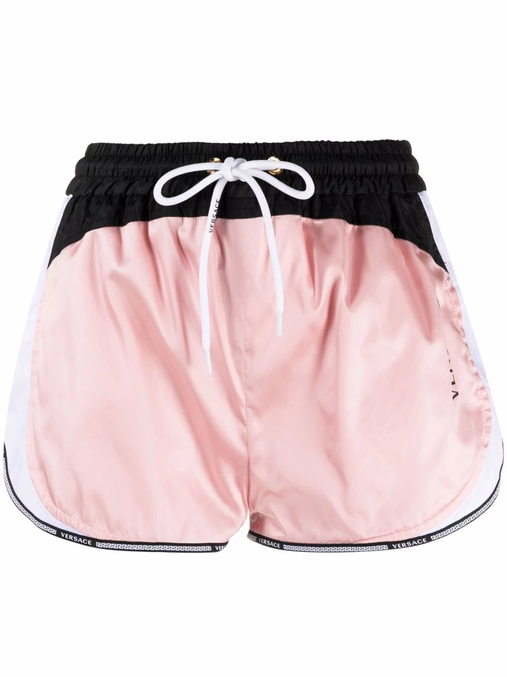 Taille élastique à lien de resserrage, coutures ton sur ton, logo imprimé sur le côté, fini satiné, design colour block, finitions à logo.