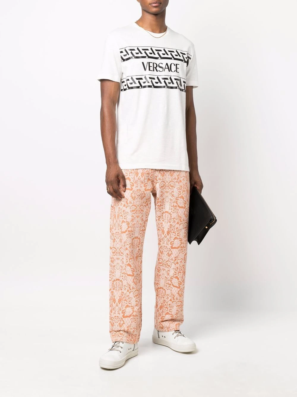 Motif Greca signature imprimé, logo imprimé à la poitrine, encolure ronde, manches courtes. Couleur : blanc. Matière : coton.
