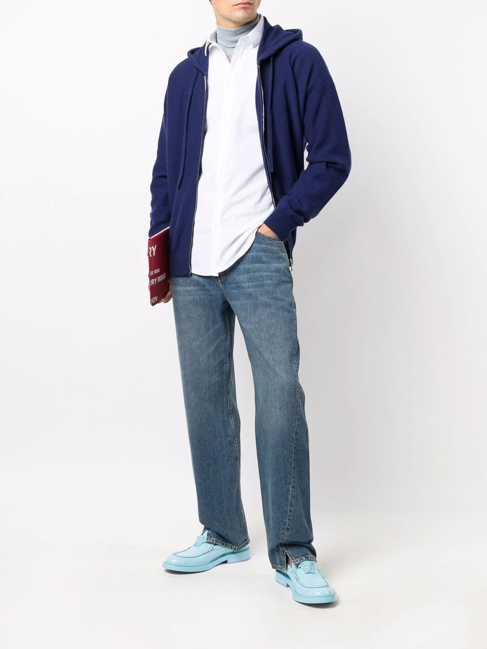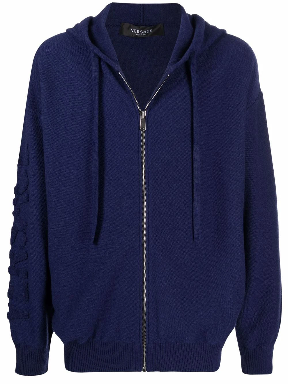 Design ton sur ton, motif Medusa, capuche à lien de resserrage, fermeture zippée devant, manches longues, patch logo sur la manche. Couleur : bleu. Matière : laine.