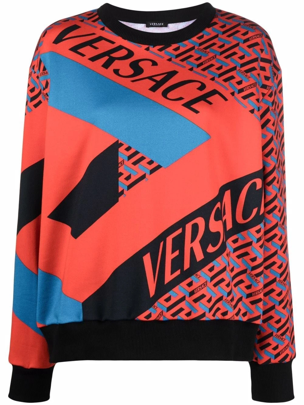 Logo imprimé à la poitrine, imprimé La Greca signature, bordures nervurées, encolure ras du cou, manches longues. Matière : coton.