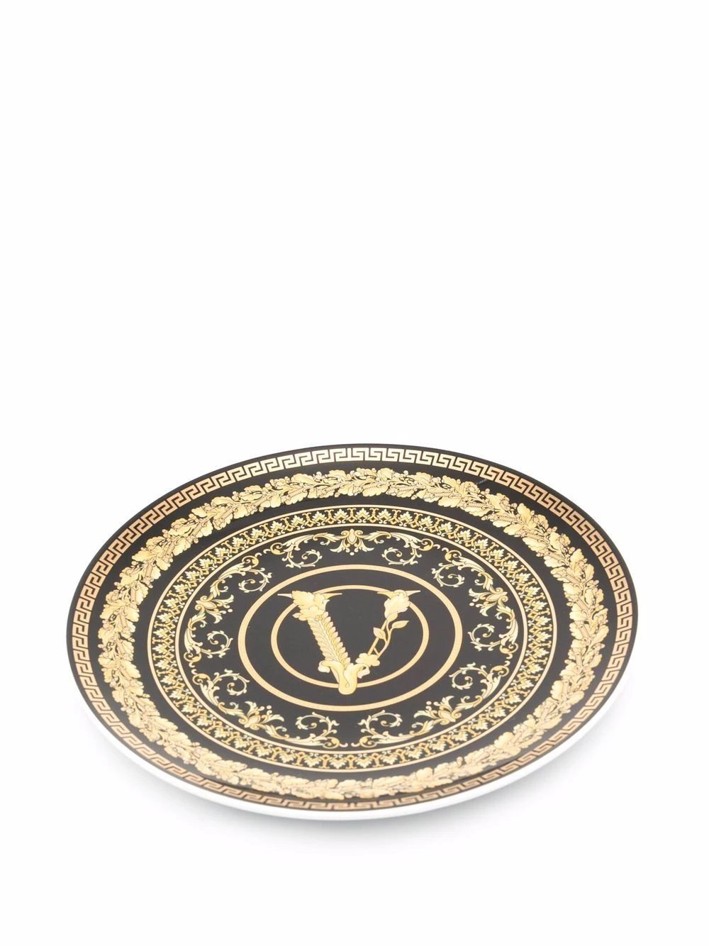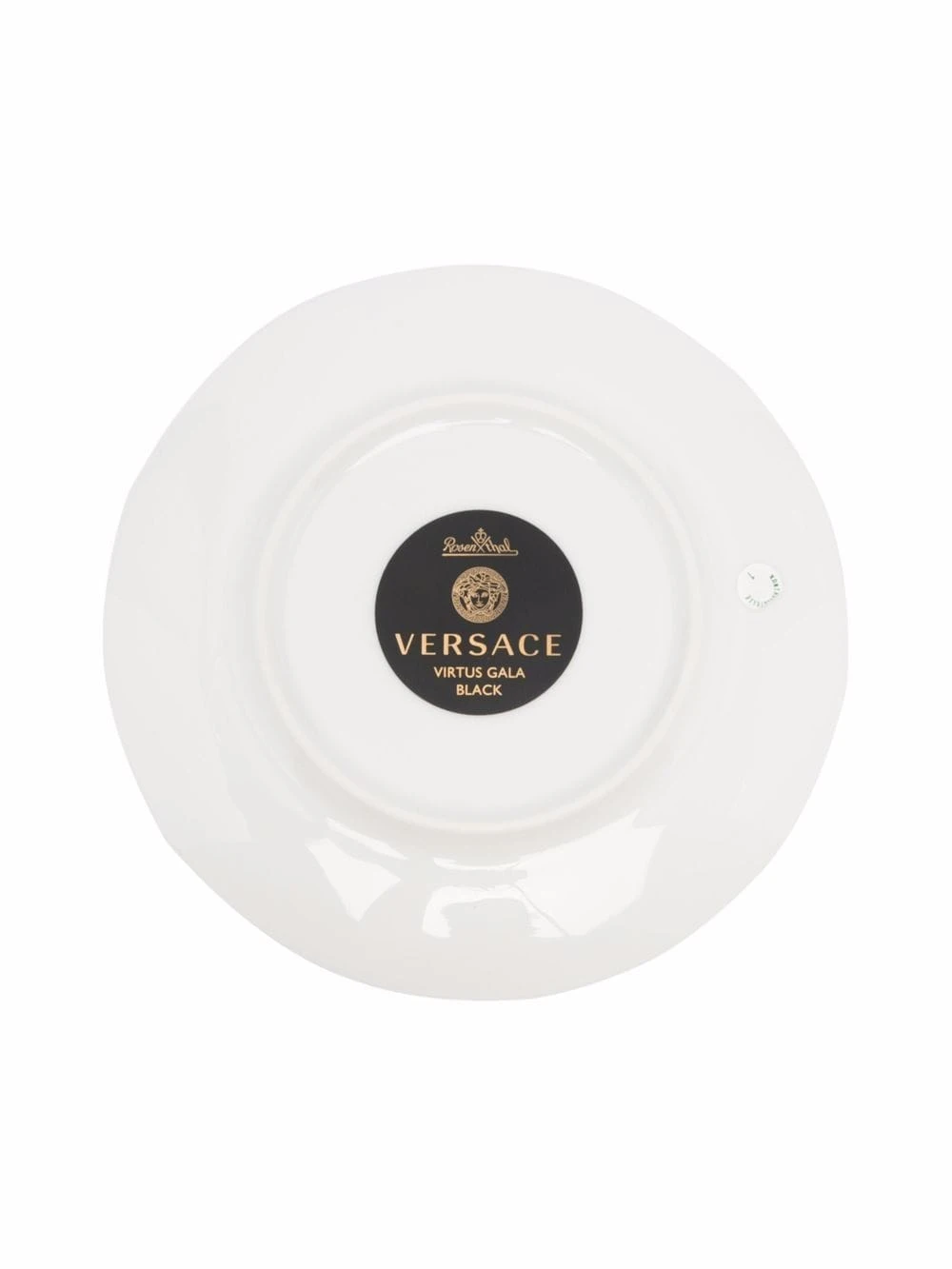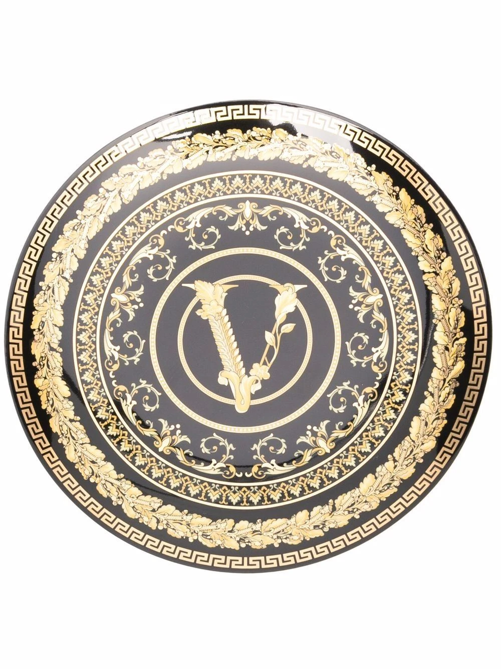 Détail de logo Virtus signature, imprimé feuillage, détail Greca signature, effet poli, lavable en lave-vaisselle. Matière : céramique.