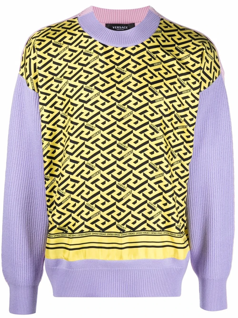 Design à empiècements colour block, motif Greca signature imprimé, design en maille, encolure ras du cou, manches longues, poignets élastiqués, ourlet élastiqué.