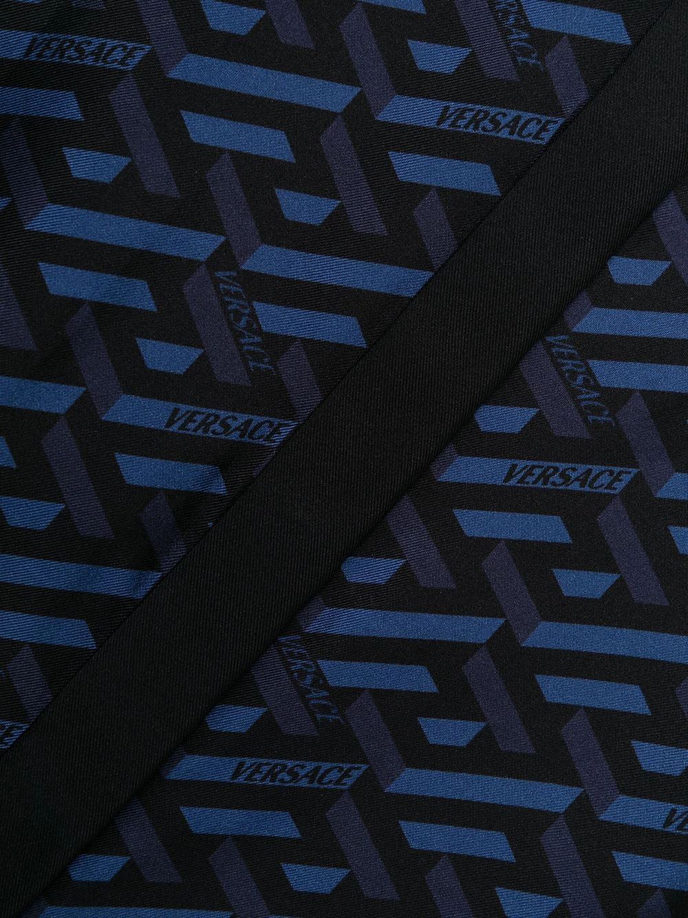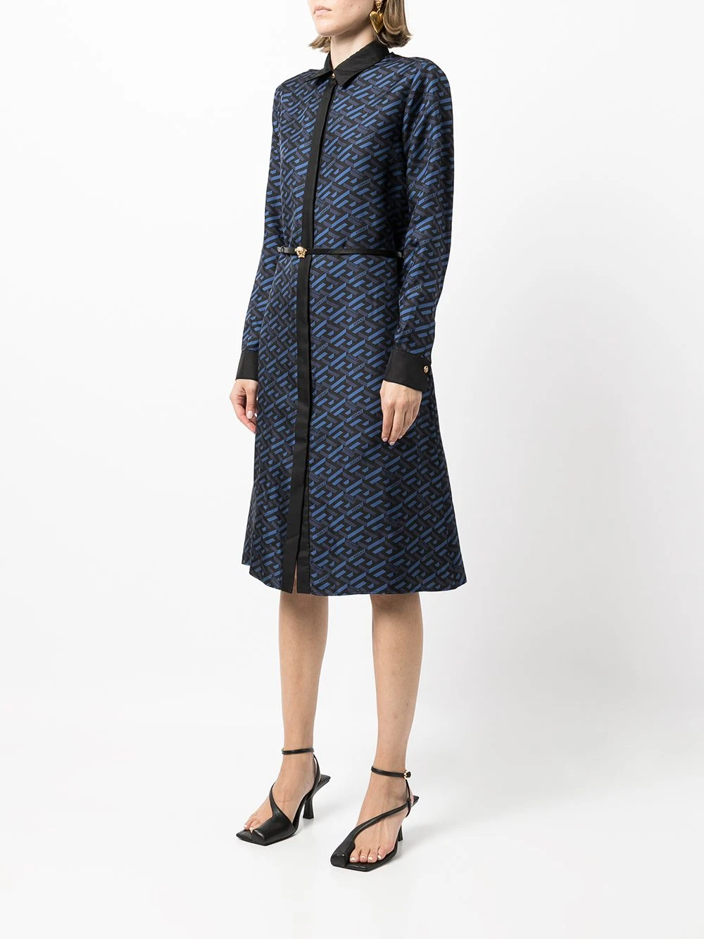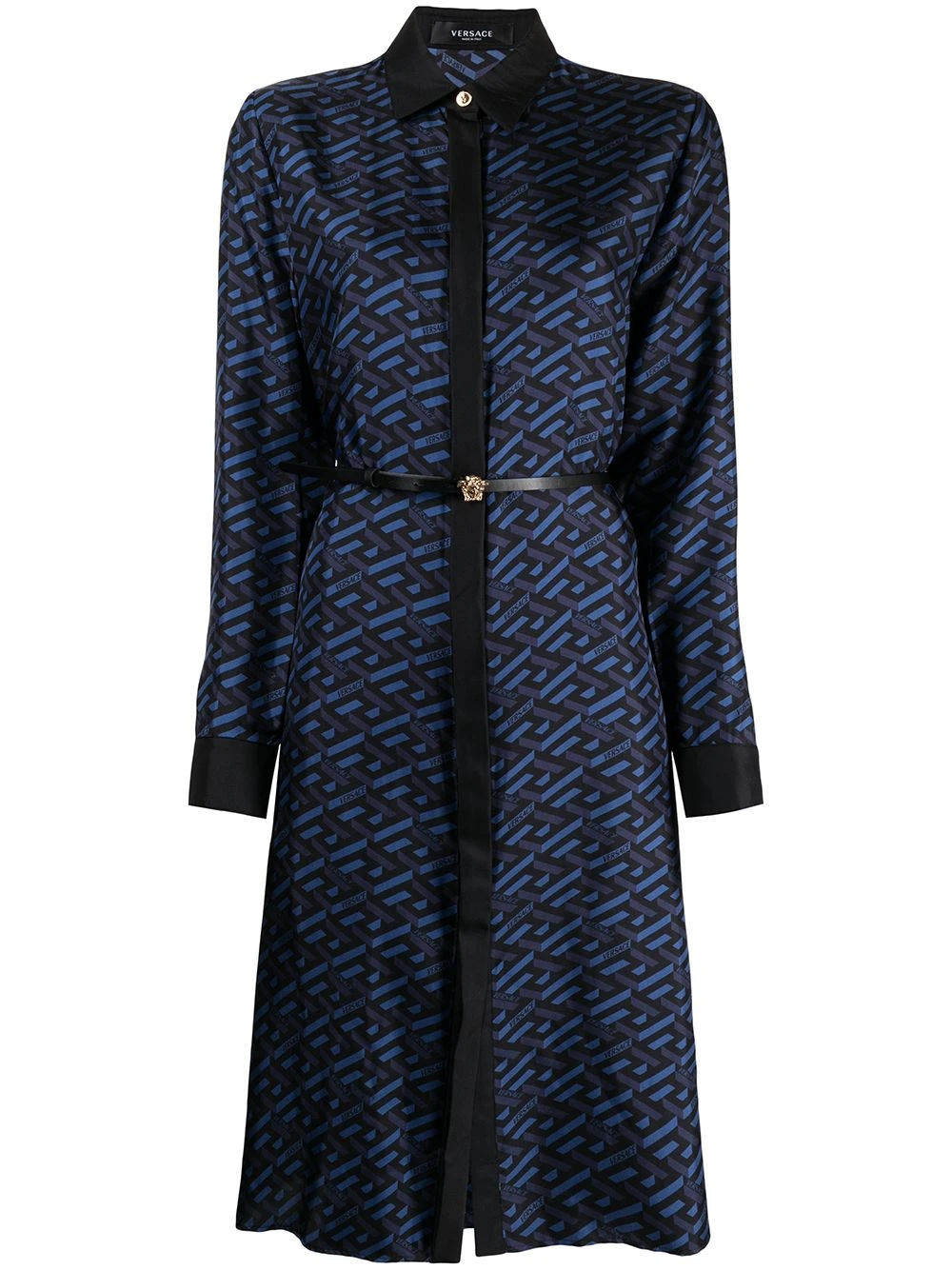 Détail Greca embossé signature, col classique, boutonnière sur le devant, manches longues, taille ceinturée, poches latérales fendues. Matière : soie.