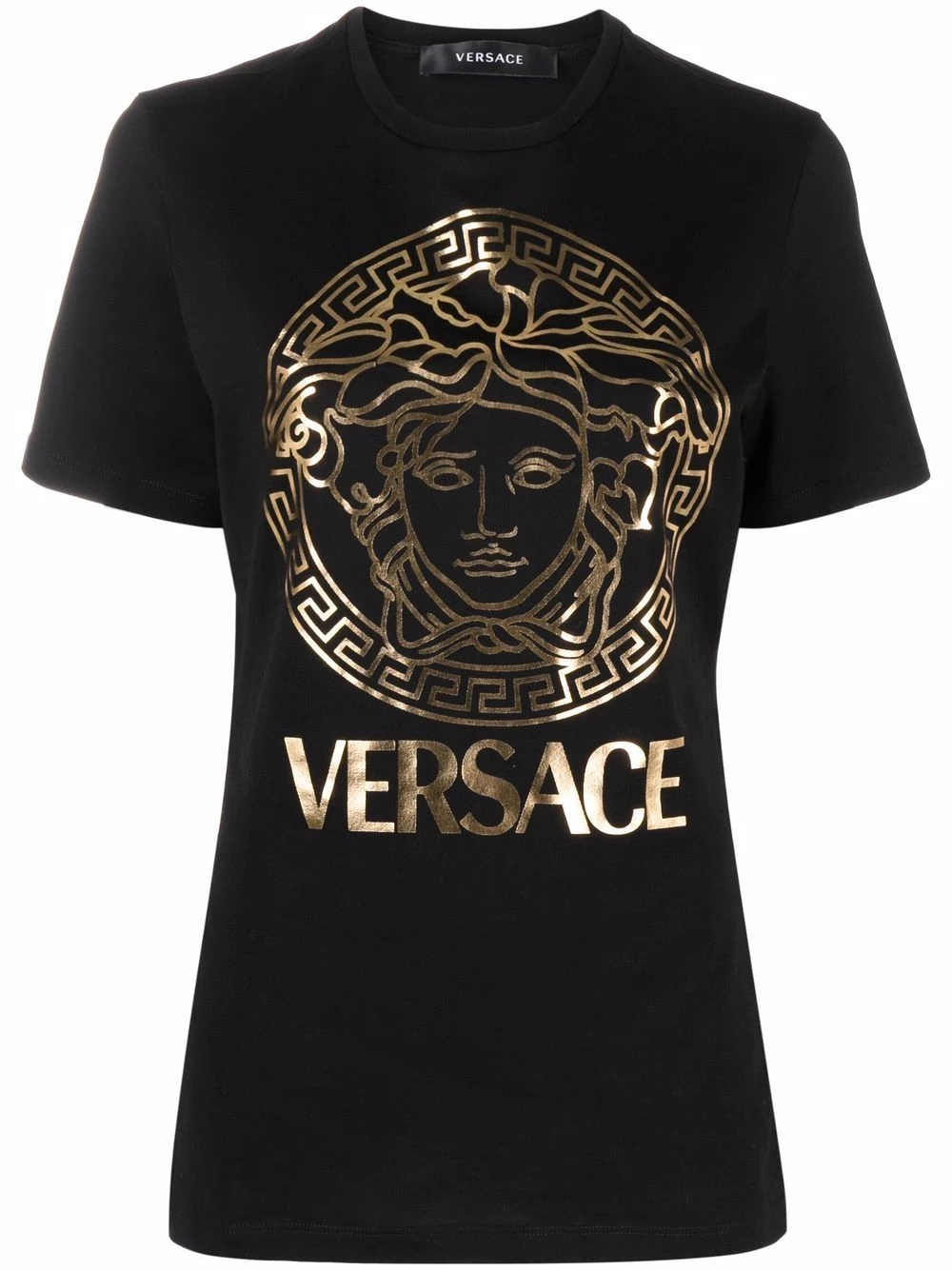 Tricot point jersey, motif Medusa, logo imprimé à la poitrine, encolure ras du cou, manches courtes, ourlet droit. Couleur : noir. Matière : coton.