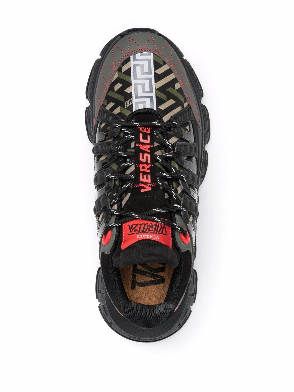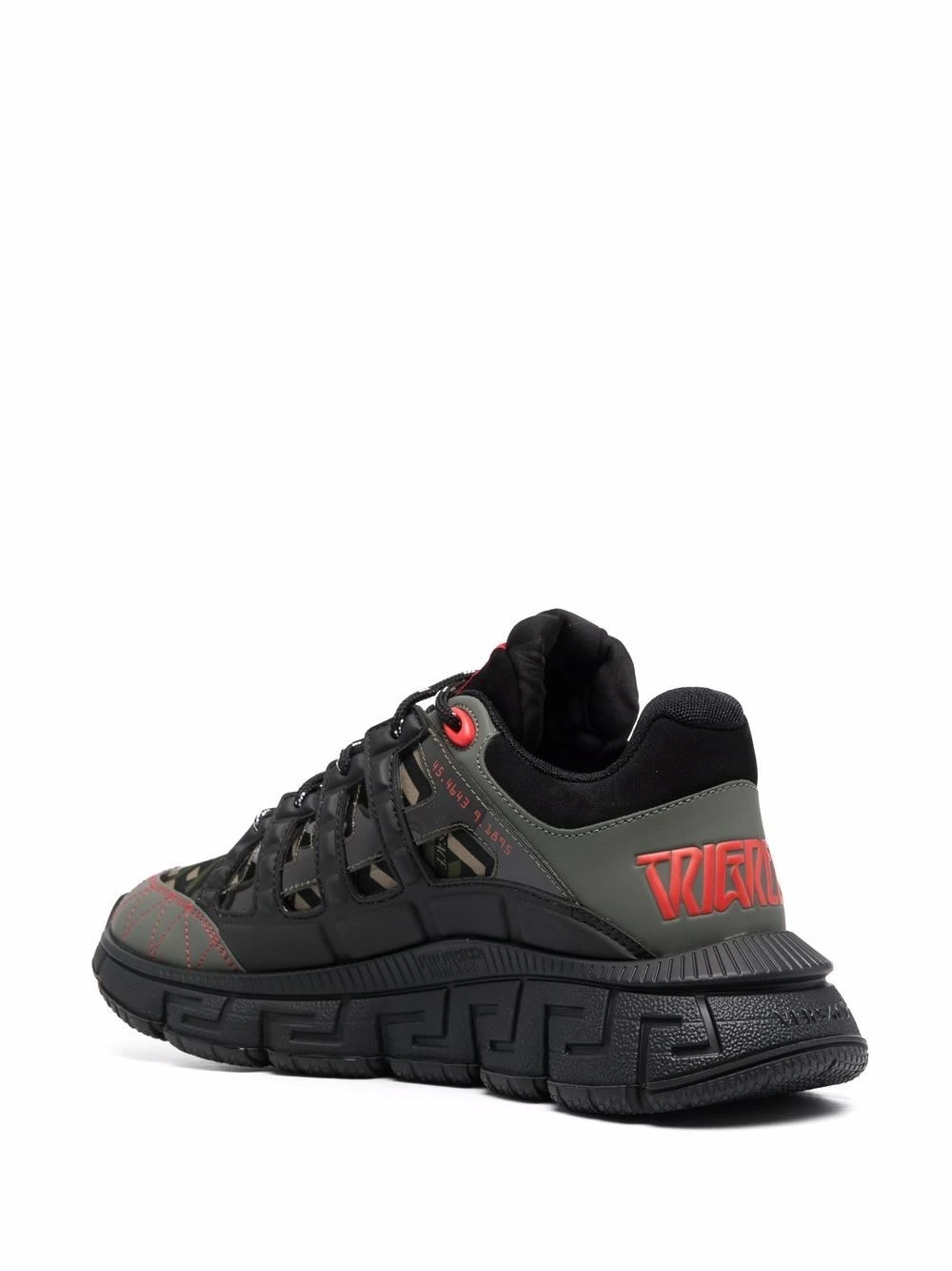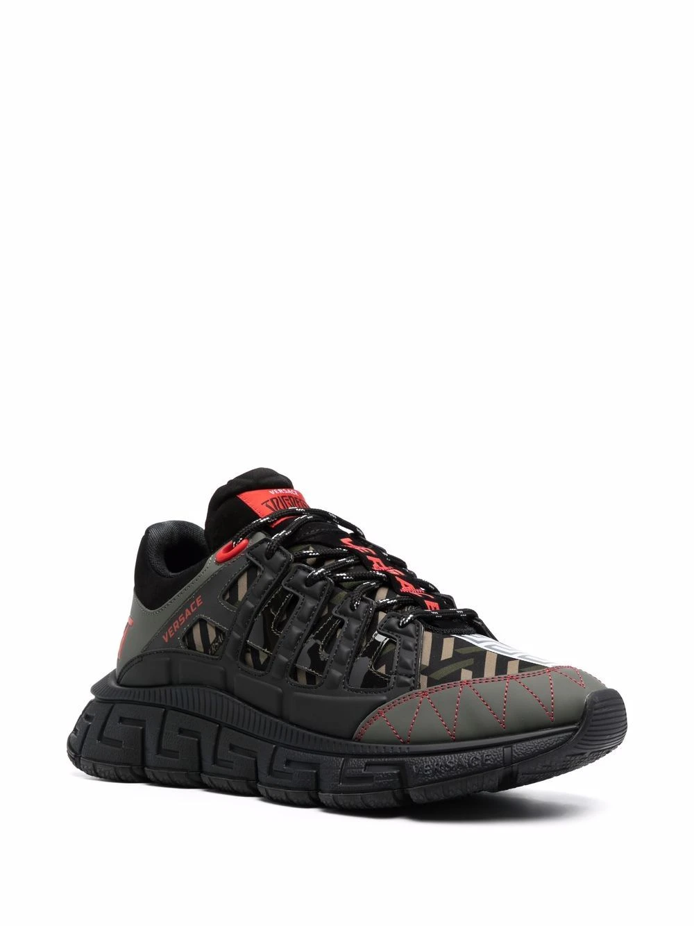 Détail Greca signature, coutures contrastantes, fermeture à lacer sur le devant, détails de découpes, design à empiècements, semelle intérieure à logo, bout en amande, chevilles rembourrées, contrefort à logo, semelle en caoutchouc.
