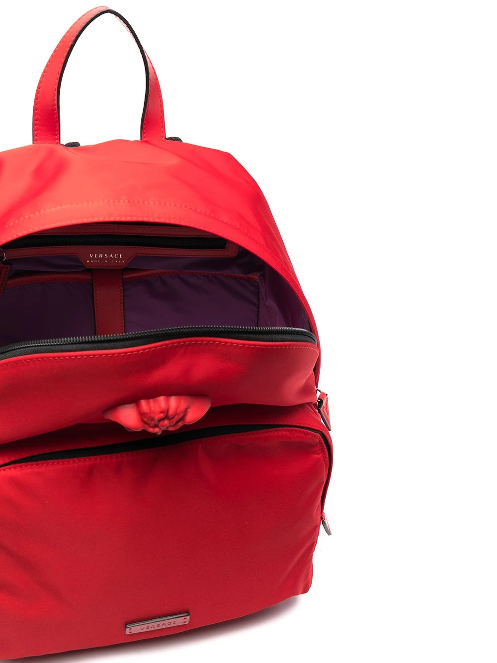 Motif Medusa, compartiment zippé sur le devant, fermeture zippée sur le dessus, anse classique, brides portées épaules ajustables. Couleur : Rouge.