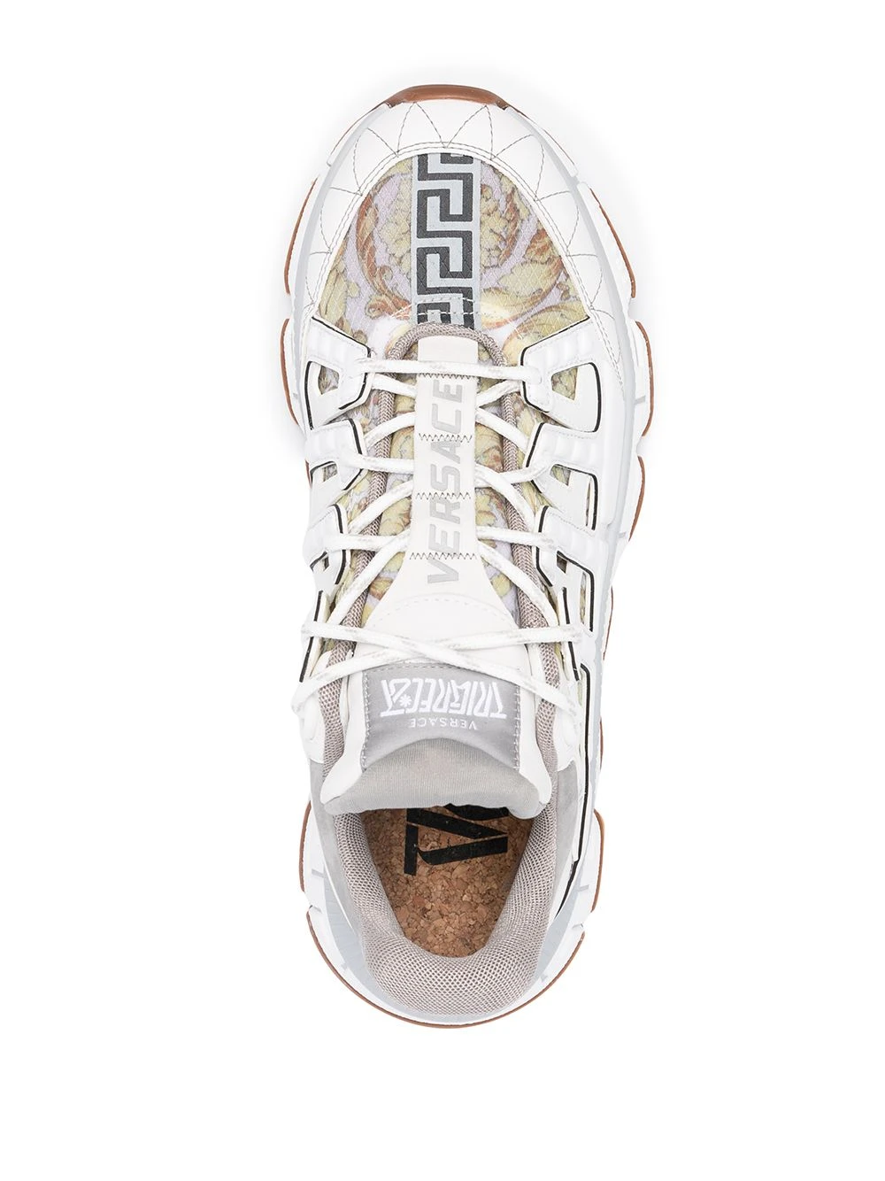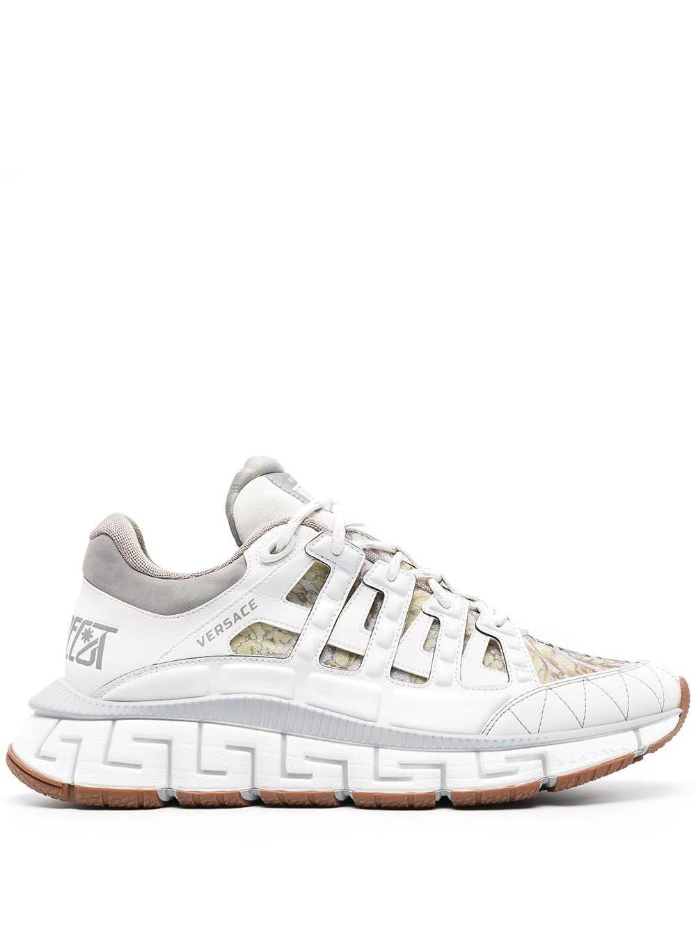 Détail Greca signature, imprimé Barocco signature, coutures contrastantes, languette à patch logo, contrefort à logo, semelle en caoutchouc. Couleur : blanc. Matière : tissu.