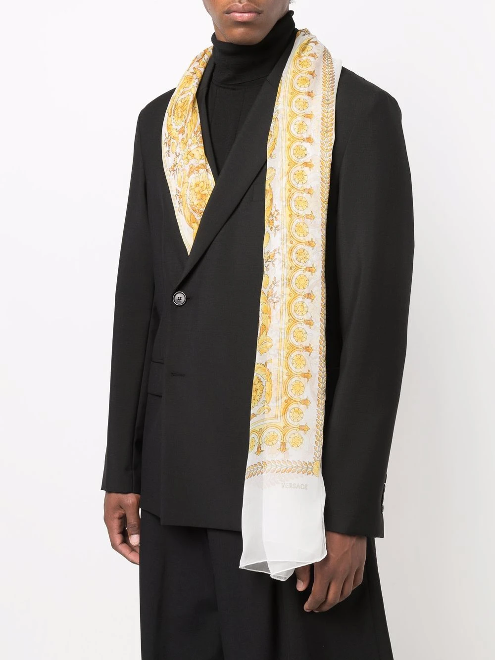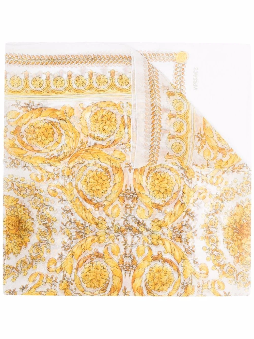 Imprimé Barocco signature, logo imprimé sur le devant, bords finis. Matière : soie.