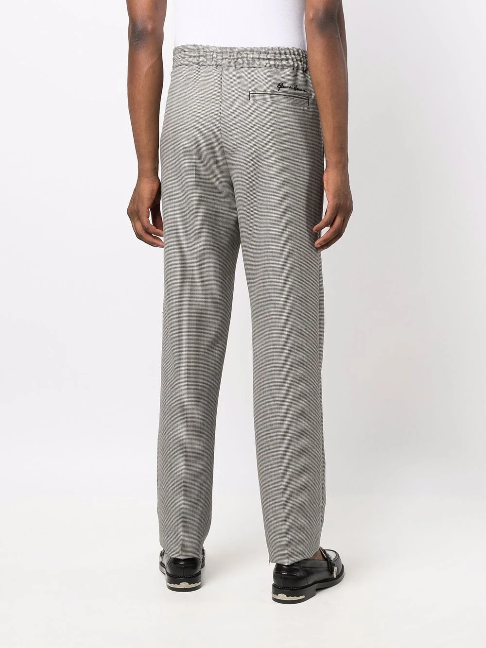 Plis marqués, logo brodé à l’arrière, taille élastique à lien de resserrage, poches latérales fendues, poches arrière passepoilées. Matière : coton.