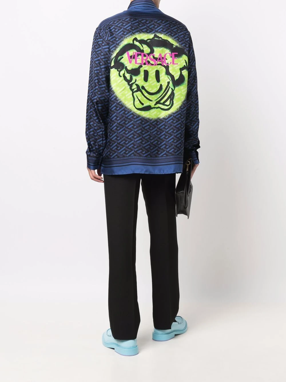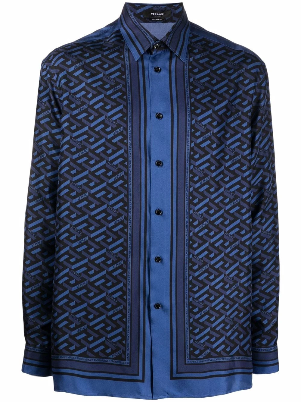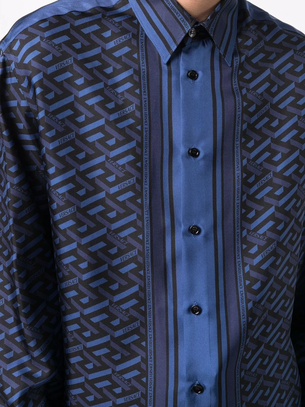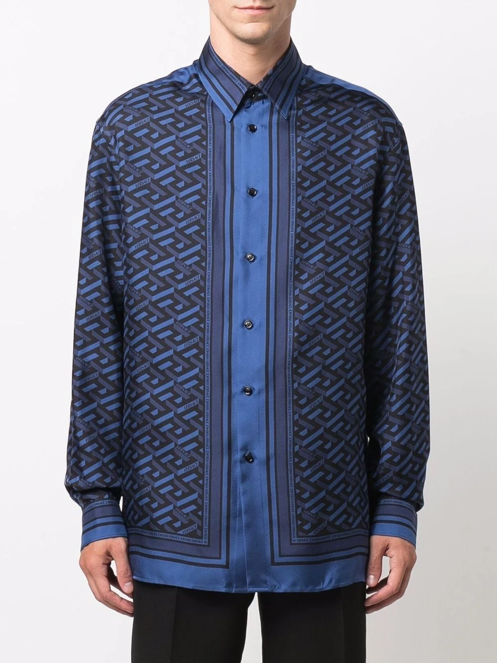 Motif géométrique, motif Medusa, col classique, boutonnière sur le devant, manches longues, poignets boutonnés. Matière : soie.