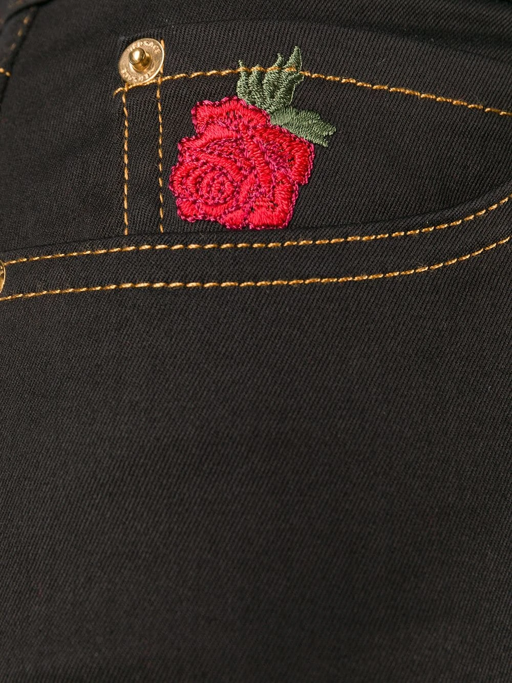 Taille haute, passants de ceinture, fermeture à zip et boutons sur le devant, 5 poches classiques, fleur brodée, logo brodé à l’arrière, coupe skinny.