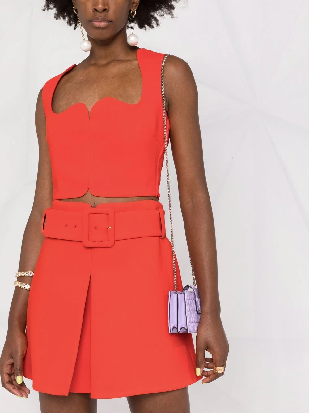 Taille ceinturée, coupe trapèze, détails de plis. Couleur : rouge.