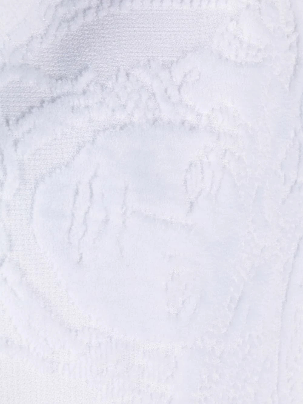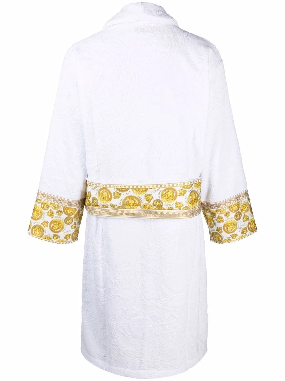Tissu éponge, détails de fronces, motif Medusa, taille ceinturée. Matière : coton.