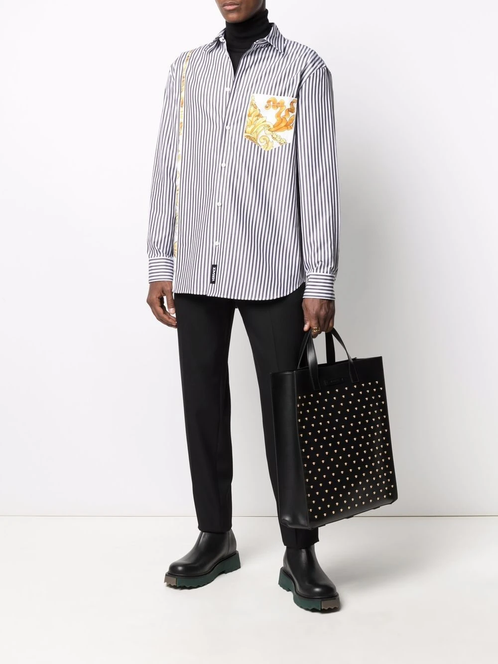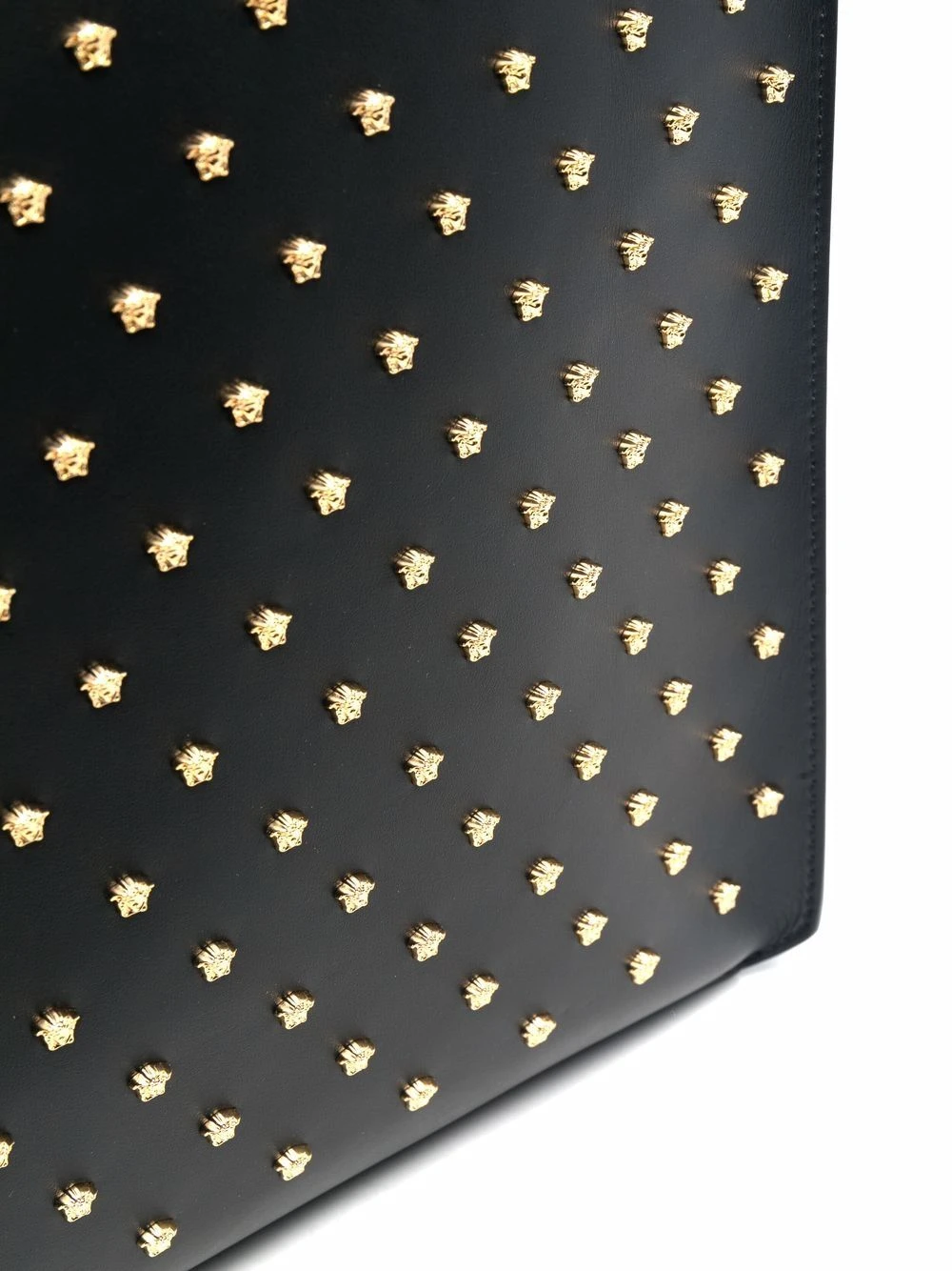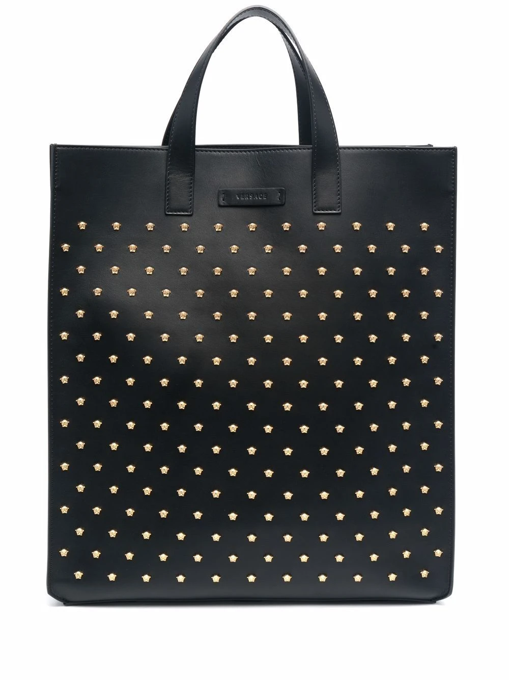Motif Medusa, patch logo sur le devant, finitions en métal doré, anses sur le dessus, ouverture sur le dessus, compartiment principal, poches intérieures zippées, poche intérieure plaquée. Couleur : noir. Matière : cuir de veau.