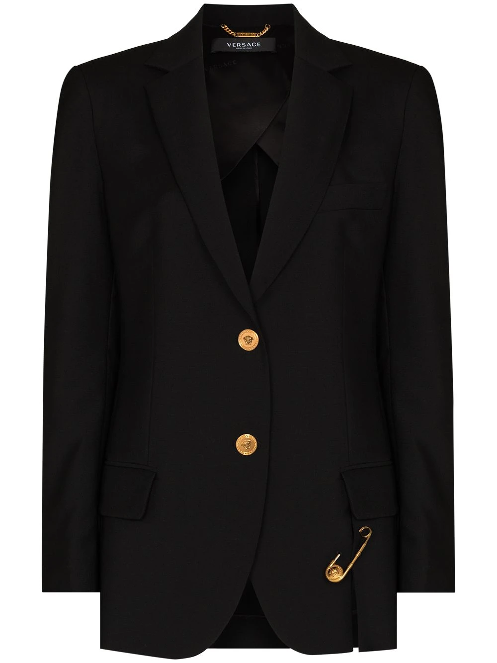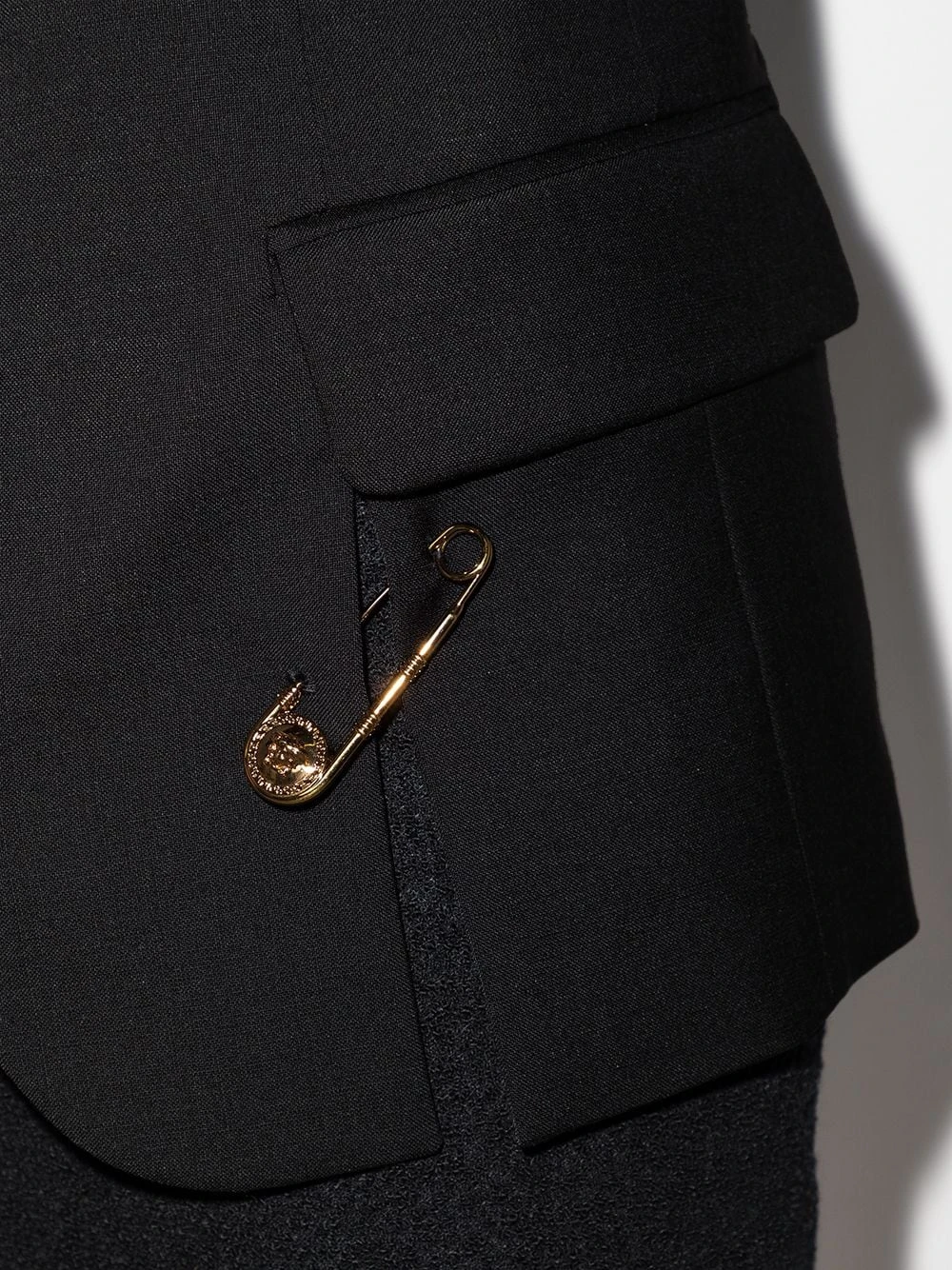 Détail d’épingle à nourrice, revers crantés, boutonnière sur le devant, poches devant à rabat, manches longues, fente arrière centrale, doublure partielle. Couleur : noir.