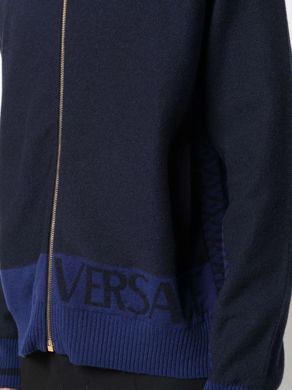 Jacquard à motif logo, imprimé La Greca signature, col montant, manches longues, fermeture zippée devant, bordures nervurées.