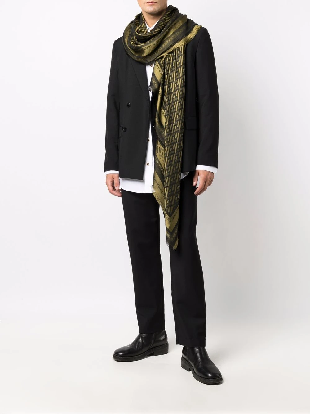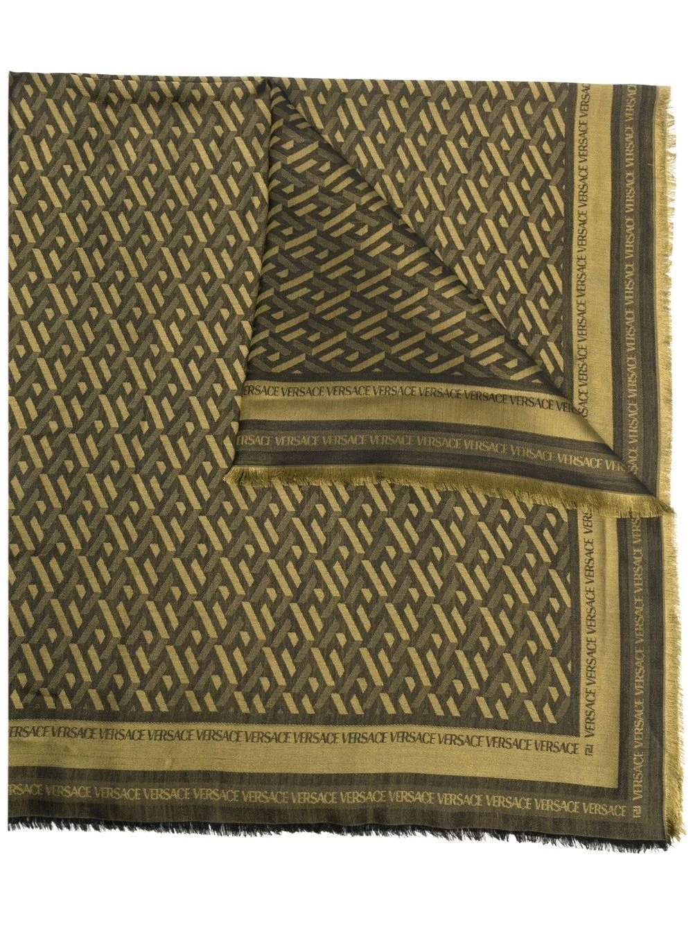 Jacquard à motifs, finitions à logo, bords frangés, maille fine.