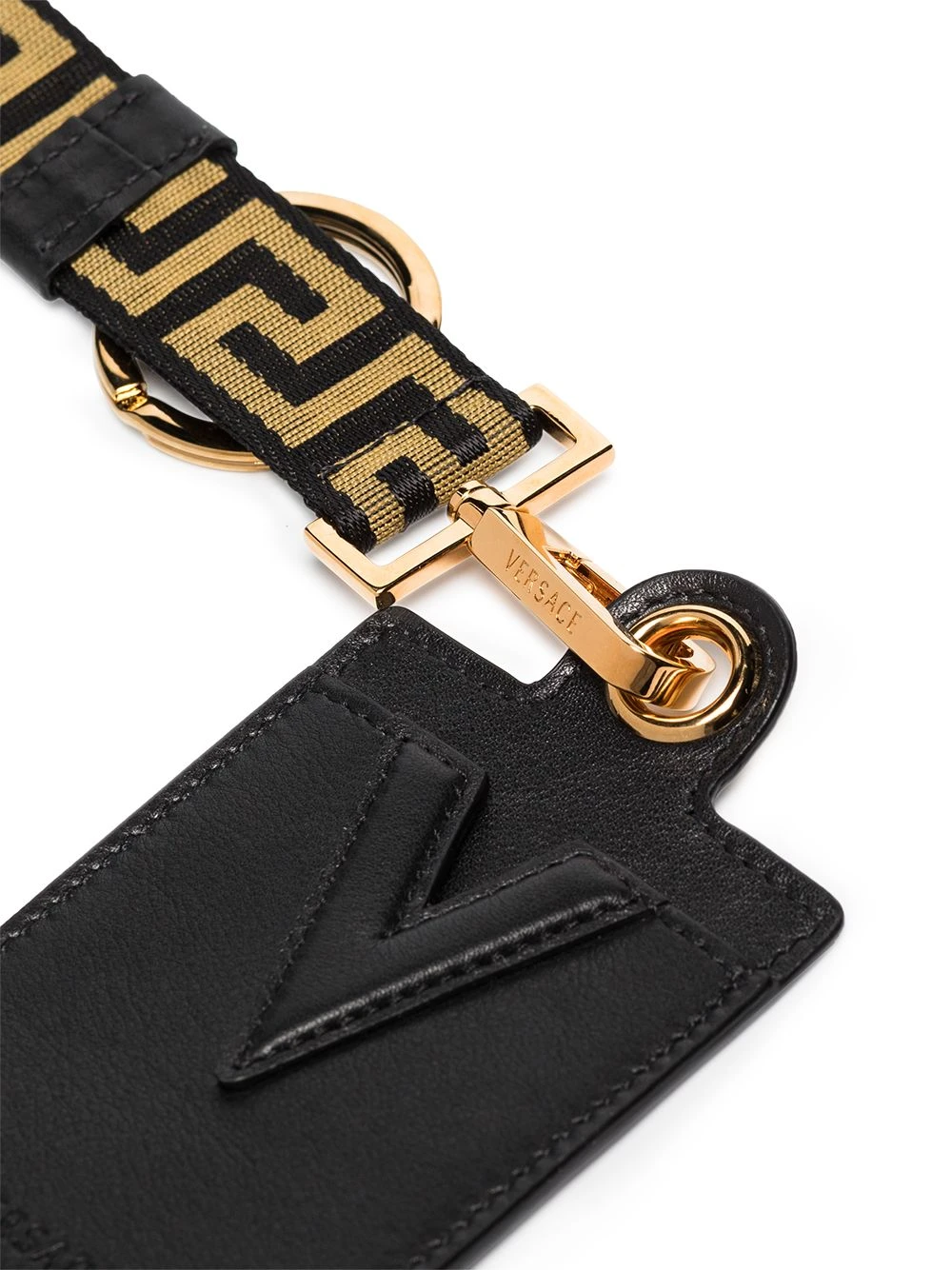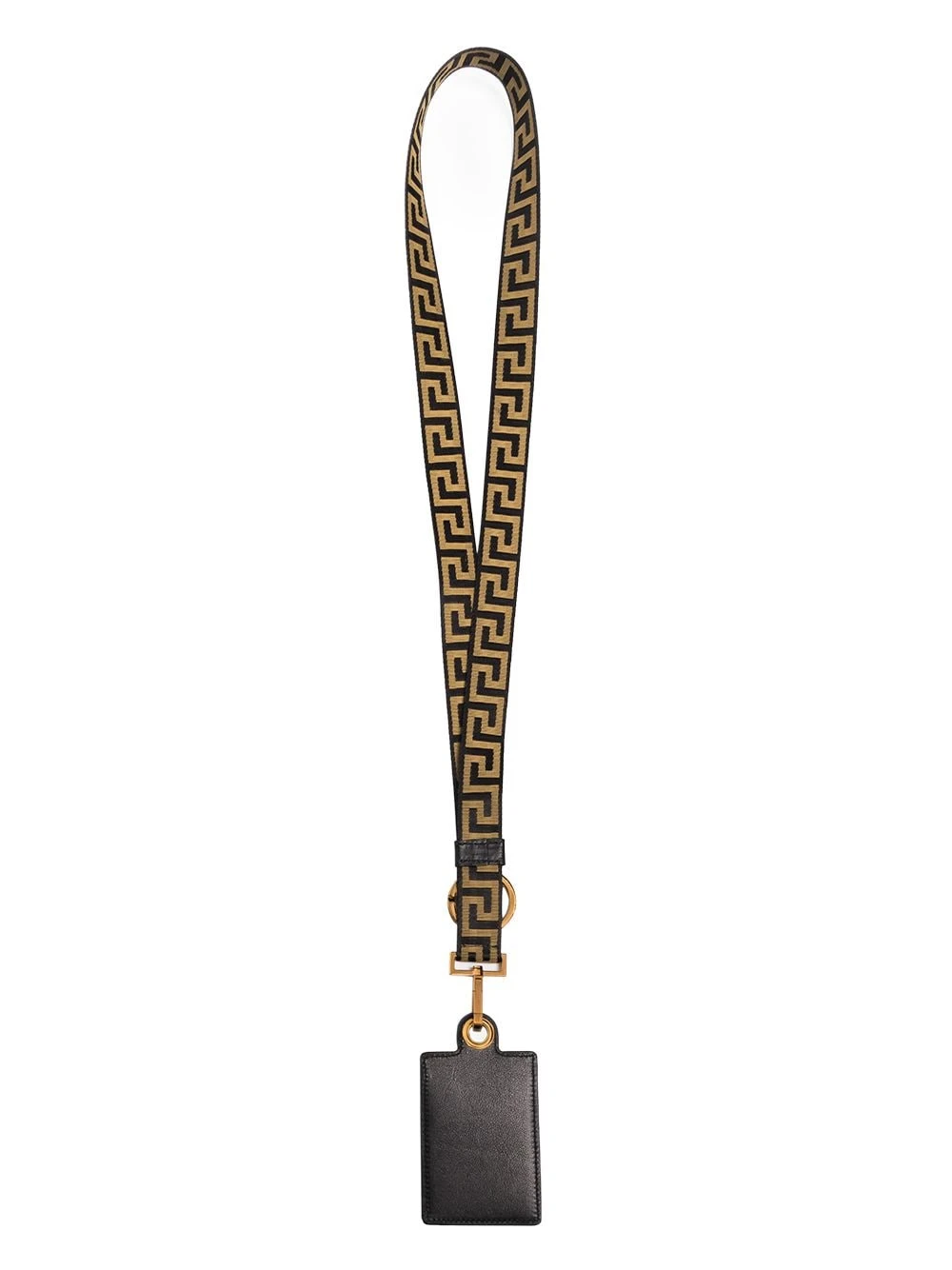 Détail Greca signature, bride porté autour du cou détachable, finitions en métal doré, compartiment unique pour carte. Matière : cuir.