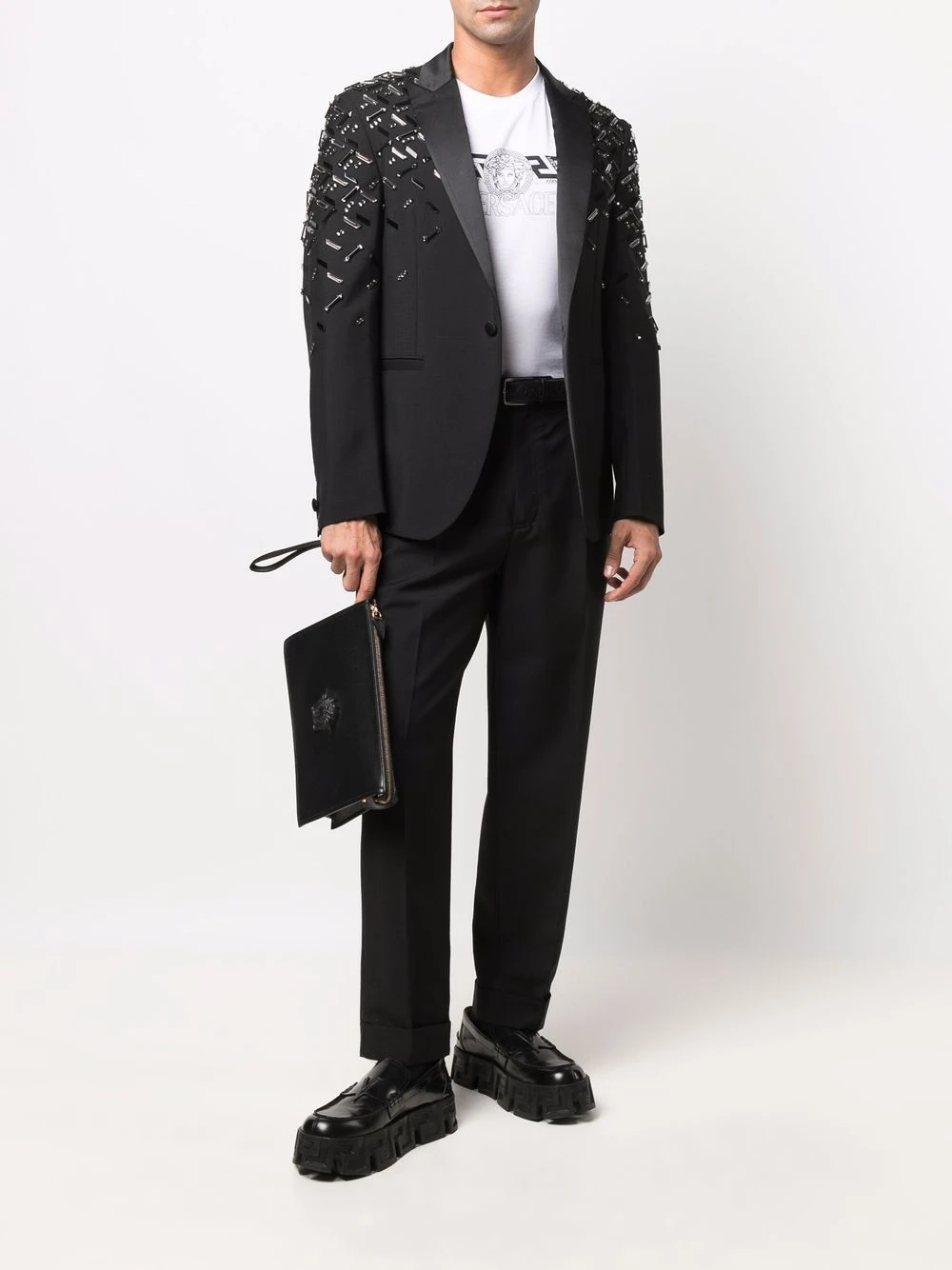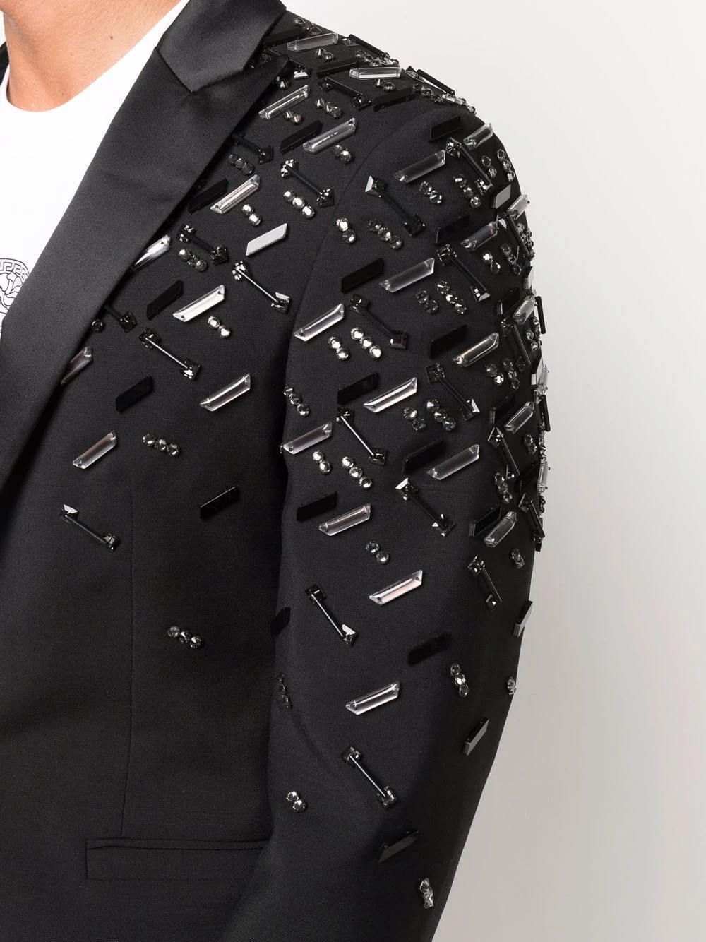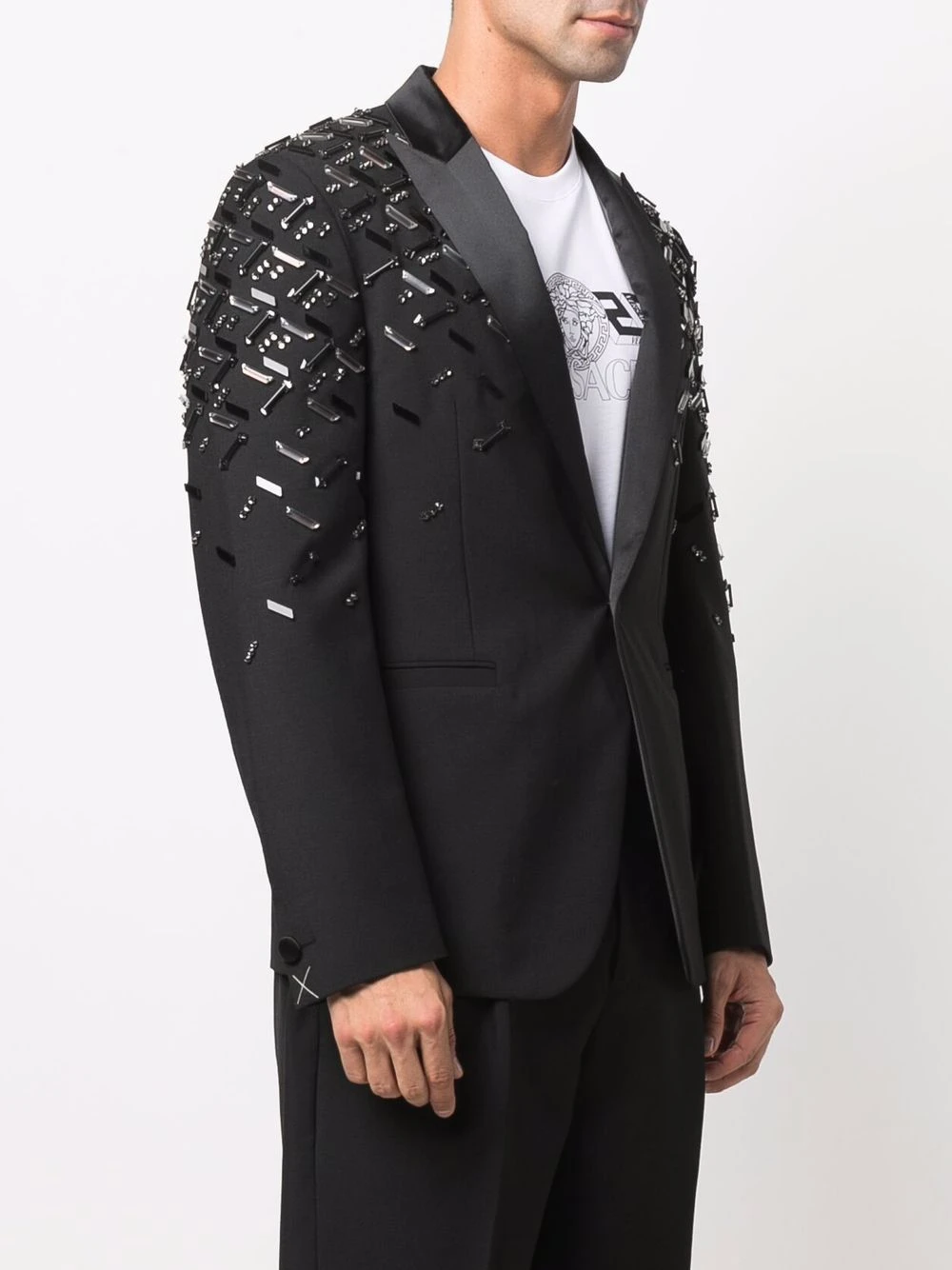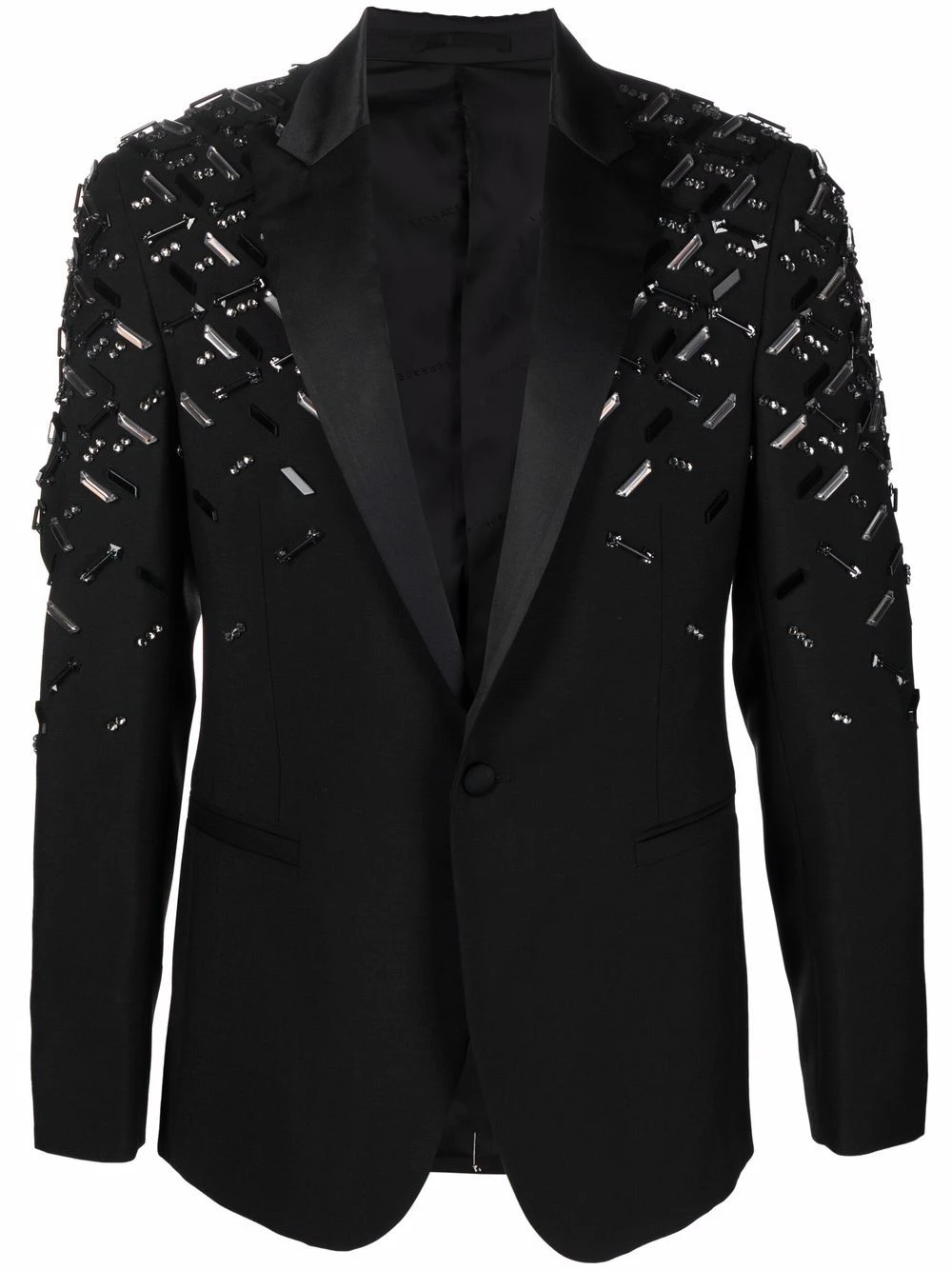 Détails de perles brodées, revers pointus, deux poches passepoilées avant, boutonnière sur le devant, manches longues. Couleur : noir.