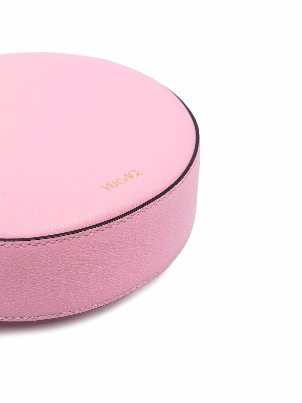 Détail Medusa, forme circulaire, logo imprimé à l’arrière, finitions en métal doré, bride porté épaule détachable et ajustable, fermeture zippée sur le dessus, compartiment principal, patch logo intérieur.