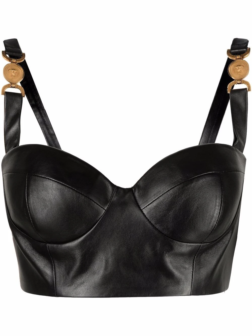 Motif Medusa, finitions en métal doré, encolure cœur, bonnets moulés, fermeture zippée apparente au dos, coupe courte. Couleur : noir. Matière : peau d’agneau.