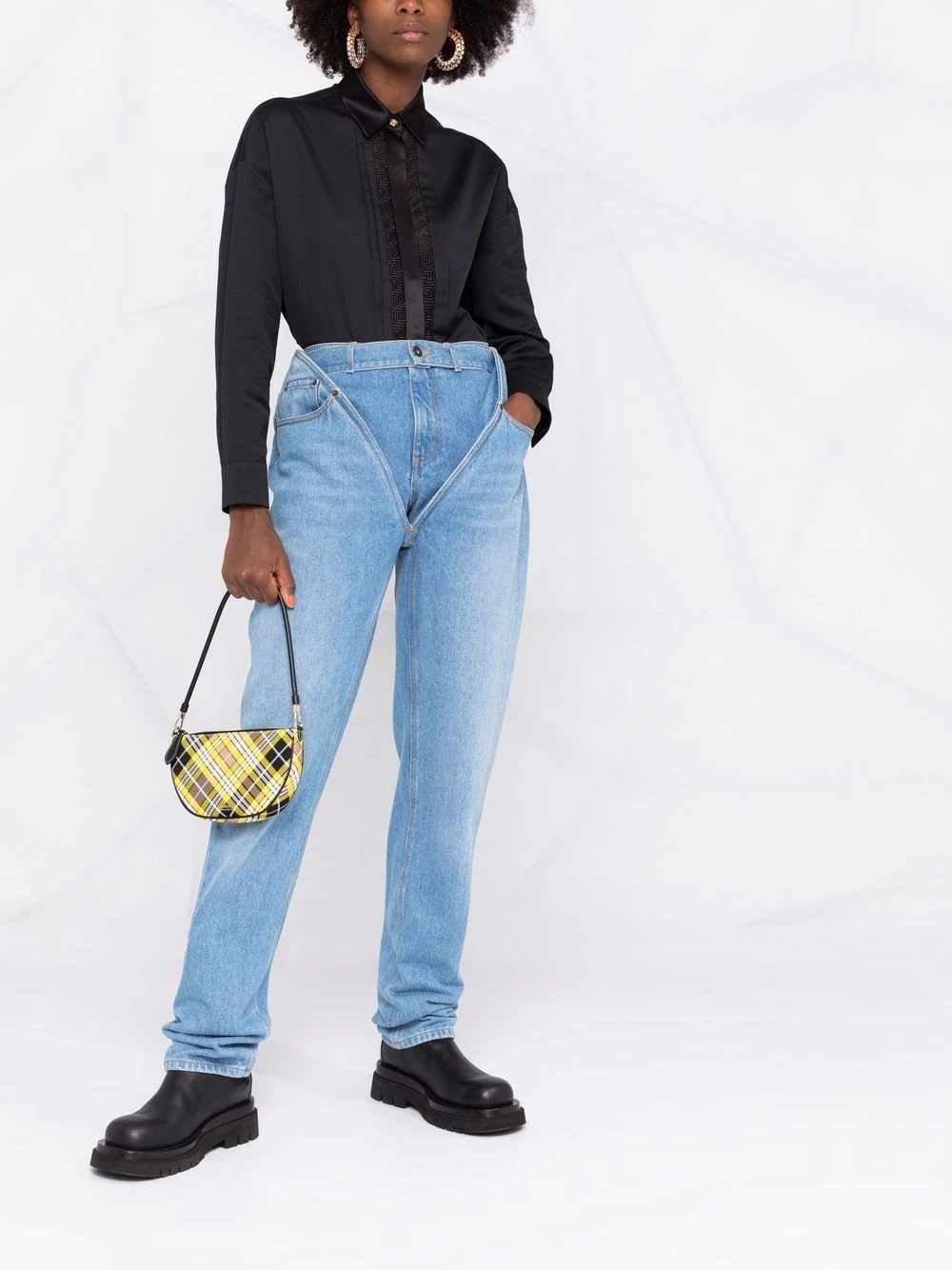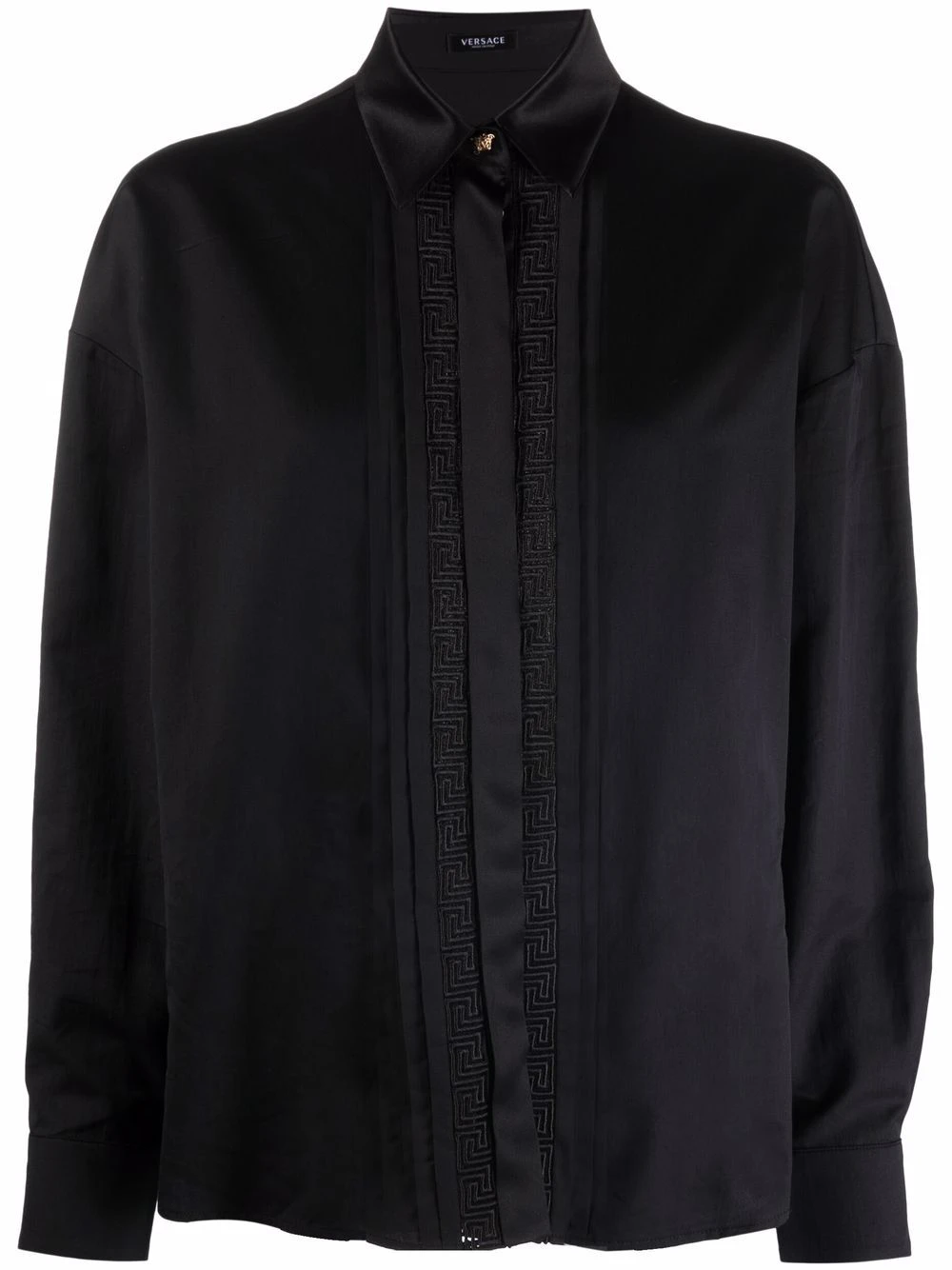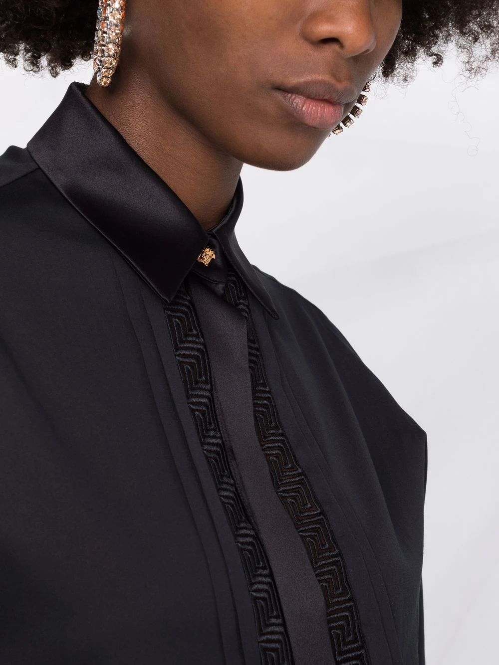 Détail Greca signature, détail Medusa, finitions en métal doré, col classique, boutonnière dissimulée sur le devant, manches longues, poignets boutonnés, ourlet droit. Couleur : noir.