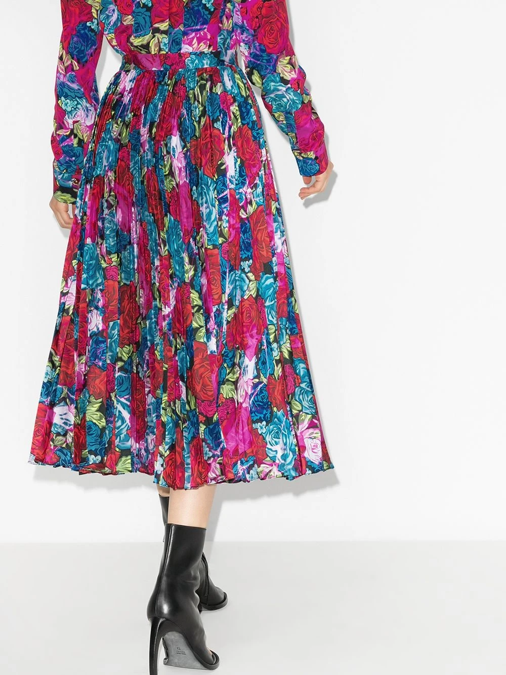 Motif de fleurs, design plissé, taille haute, fermeture dissimulée sur le devant, coupe mi-longue.