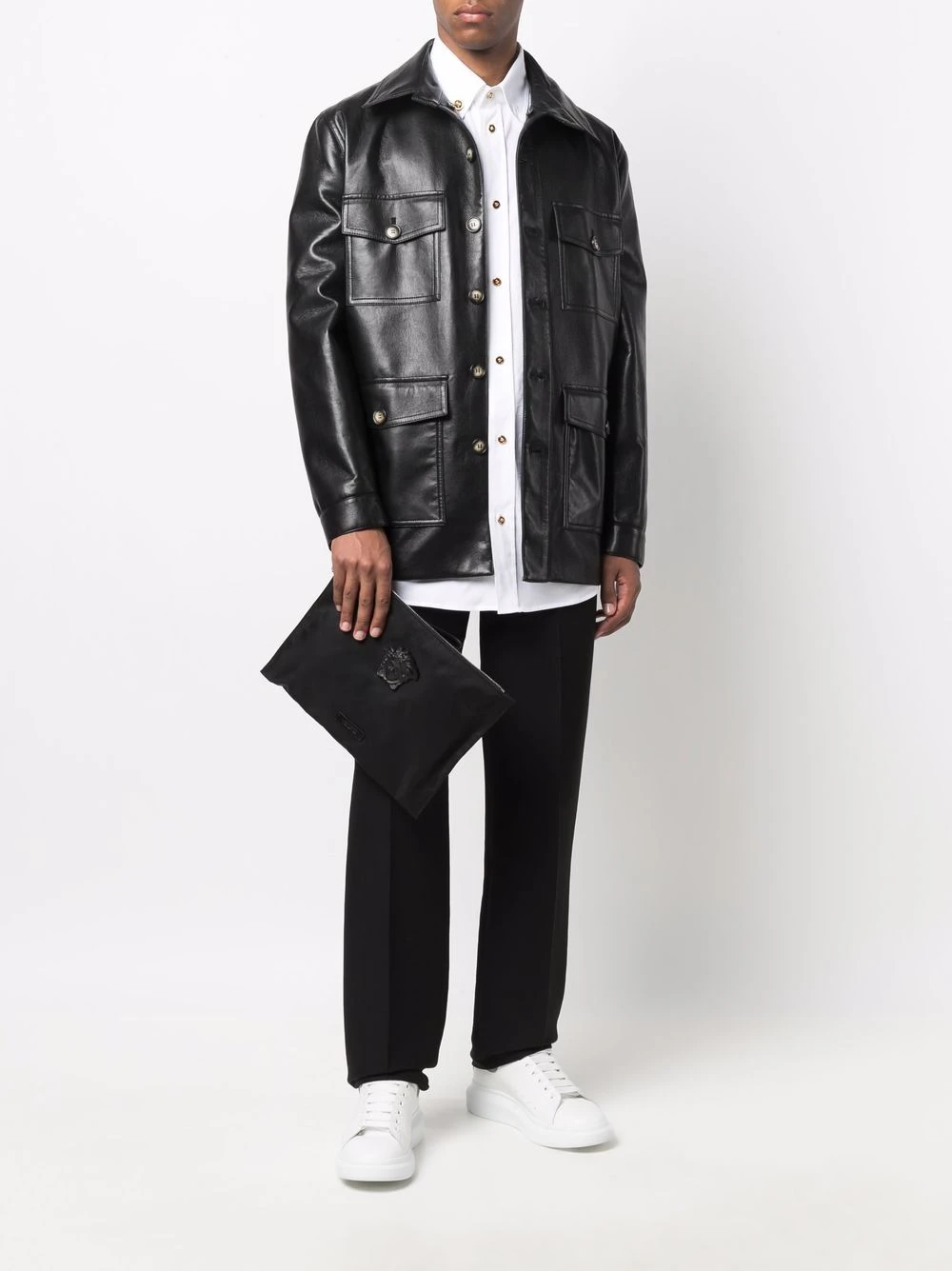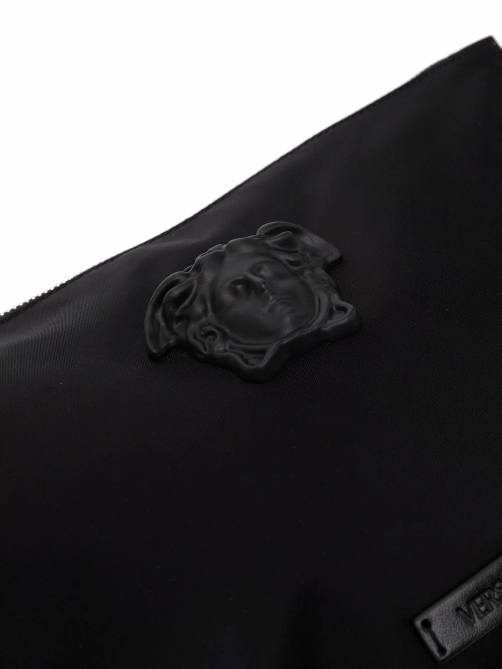 Motif Medusa, liseré en cuir, fermeture zippée sur le dessus, bride porté poignet, poches intérieures zippées, doublure intégrale. Couleur : noir.