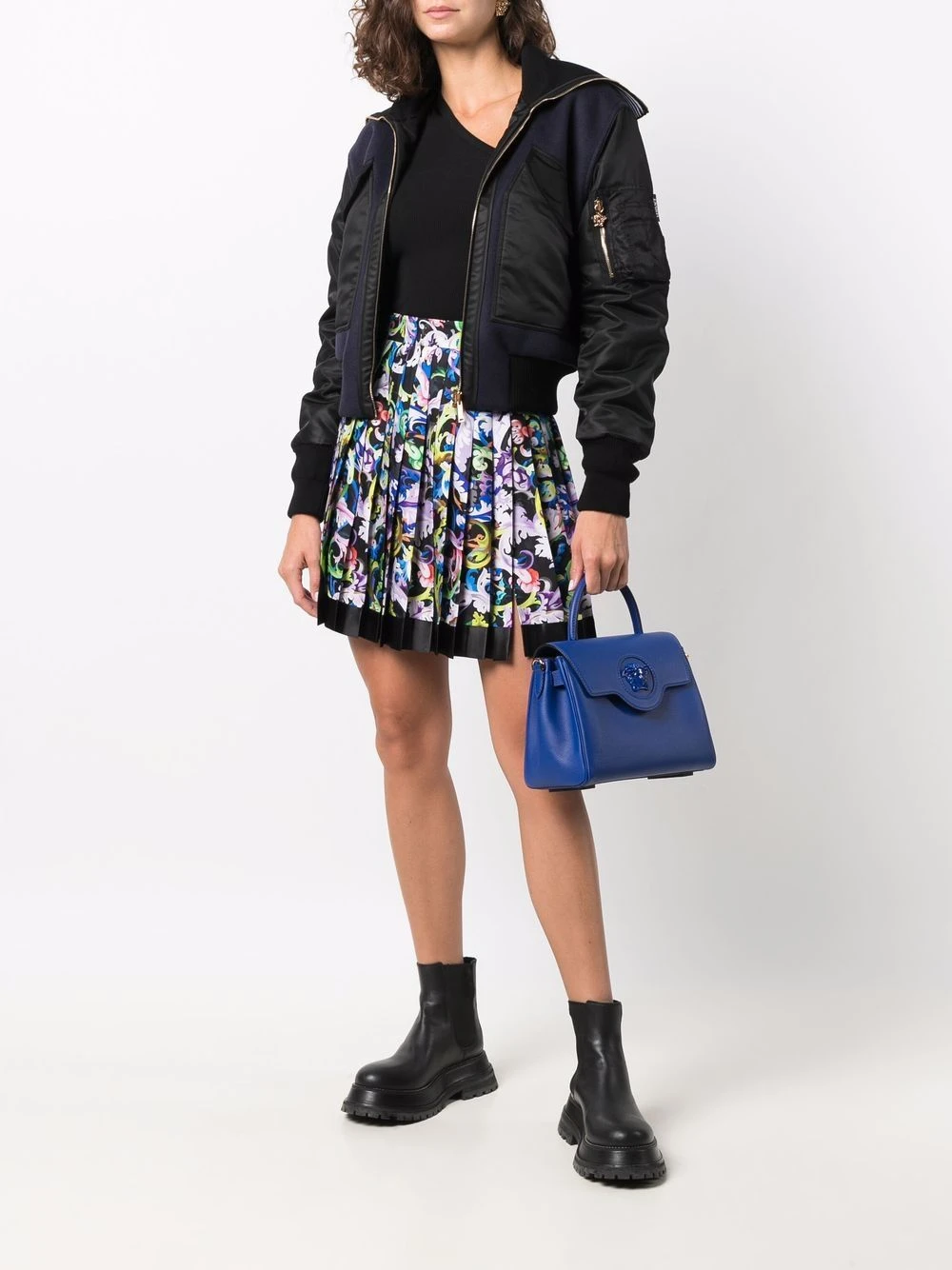 Modèle bicolore, logo intarsia, fermeture zippée devant, manches longues, poche zippée sur la manche, deux poches poitrine à rabat, coupe courte. Matière : laine vierge.