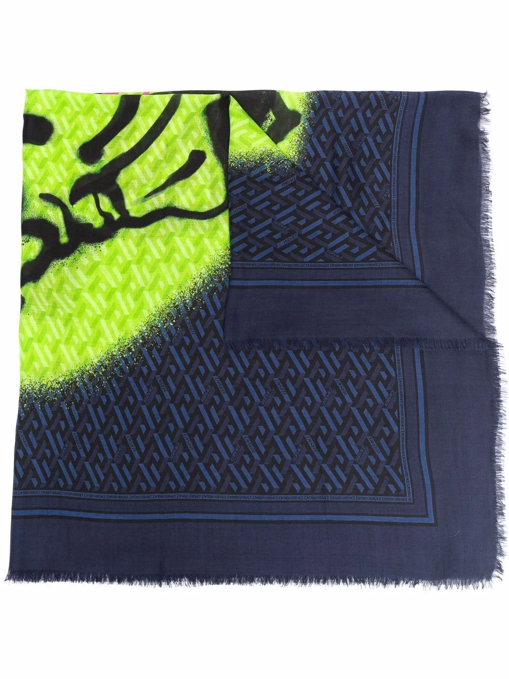 Imprimé monogrammé, motif Medusa, détail Greca signature, imprimé graffiti, bordure à franges, design multi-tours, coupe longue.