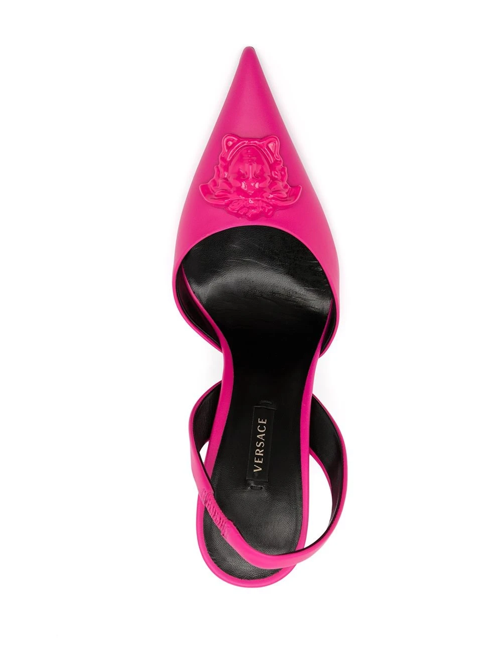 Détail Medusa, semelle intérieure griffée, bride arrière élastique, talon sculpté haut, bout pointu. Matière : cuir.
