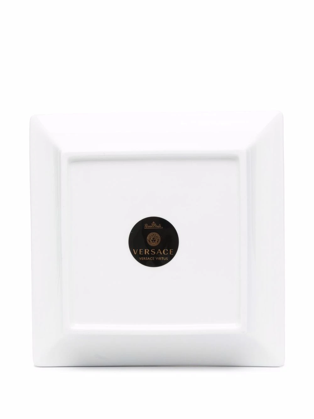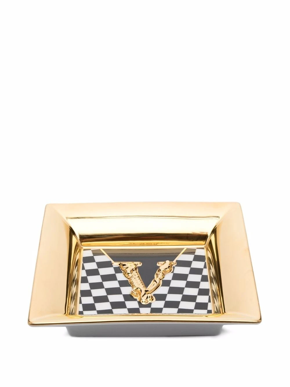 Effet métallisé, motif damier, logo lettre, forme carrée. Matière : céramique.